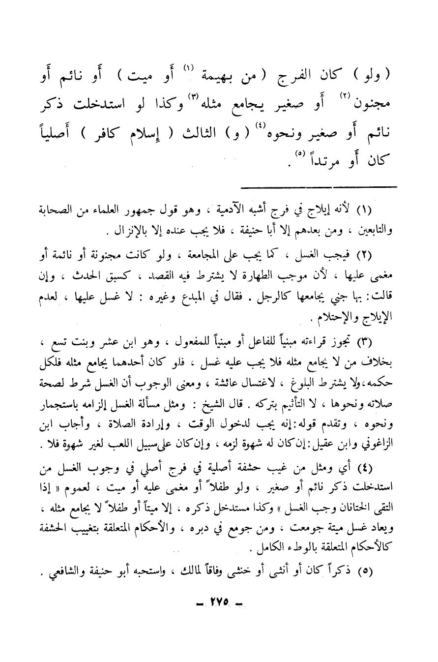 (ولو) كان الفرج (من بهيمة (¬1) أو ميت) أو نائم أو مجنون (¬2) أو صغير يجامع مثله (¬3) وكذا لو استدخلت ذكر نائم أو صغير ونحوه (¬4) (و) الثالث (إسلام كافر) أصليا كان أو مرتدا (¬5) .