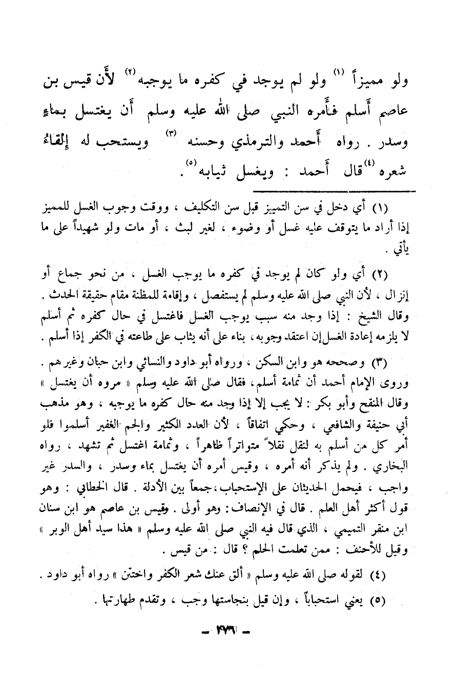(¬3) وصححه هو وابن السكن ورواه أبو داود والنسائي وابن حبان وغيرهم وروى الإمام أحمد أن ثمامة أسلم، فقال صلى الله عليه وسلم مروه أن يغتسل وقال المنقح وأبو بكر: لا يجب إلا إذا وجد منه حال كفره ما يوجبه، وهو مذهب أبي حنيفة والشافعي، وحكي اتفاقا، لأن العدد الكثير والجم الغفير أسلموا فلو أمر كل من أسلم به لنقل نقلا متواترا ظاهرا، وثمامة اغتسل ثم تشهد، رواه البخاري، ولم يذكر أنه أمره، وقيس أمره أن يغتسل بماء وسدر، والسدر غير واجب، فيحمل الحديثان على الاستحباب جمعا بين الأدلة، قال الخطابي: وهو قول أكثر أهل العلم، قال في الإنصاف: وهو أولى، وقيس بن عاصم هو ابن سنان ابن منقر التميمي، الذي قال به النبي صلى الله عليه وسلم هذا سيد أهل الوبر وقيل للأحنف: ممن تعلمت الحلم؟ قال: من قيس.