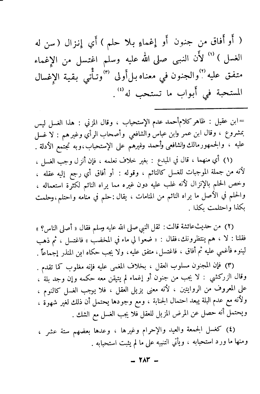 (¬2) من حديث عائشة قالت: ثقل النبي صلى الله عليه وسلم فقال: «أصلى الناس؟» فقلنا: لا، هم ينتظرونك، فقال: (ضعوا لي ماء في المخضب) فاغتسل، ثم ذهب لينوء فأغمي عليه ثم أفاق، فاغتسل متفق عليه، ولا يجب حكاه ابن المنذر إجماعا.