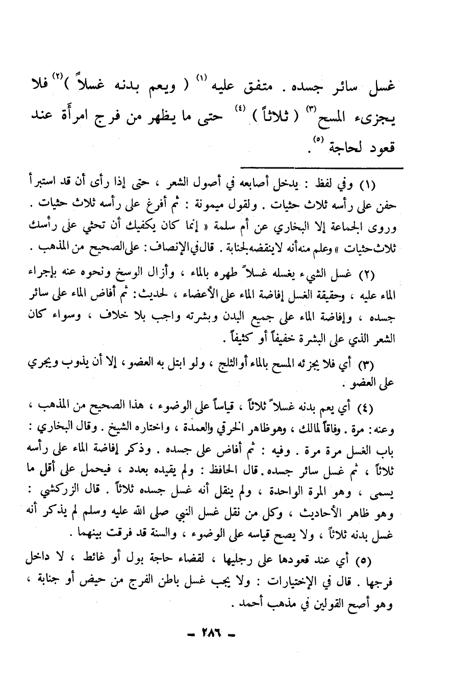 غسل سائر جسده متفق عليه (¬1) (ويعم بدنه غسلا) (¬2) فلا يجزئ المسح (¬3) ثلاثا (¬4) حتى ما يظهر من فرج امرأة عند قعود لحاجة (¬5) .