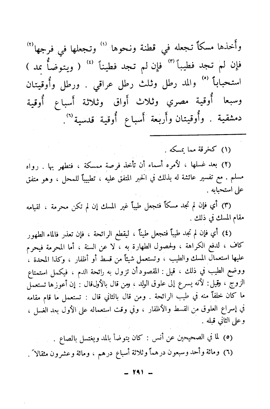 وأخذها مسكا تجعلها في قطنة ونحوها (¬1) وتجعلها في فرجها (¬2) فإن لم تجد فطيبا (¬3) فإن لم تجد فطينا (¬4) (ويتوضأ بمد) استحبابا (¬5) والمد رطل وثلث رطل عراقي، ورطل وأوقيتان وسبعا أوقية مصري وثلاث أواق وثلاثة أسباع أوقية دمشقية وأوقيتان وأربعة أسباع أوقية قدسية (¬6) .