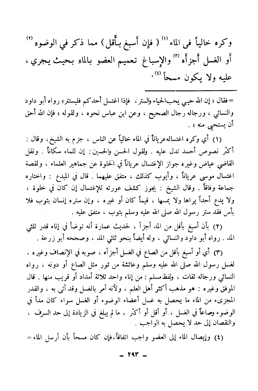 (¬3) أي وأسبغ بأقل من الصاع في الغسل أجزأه، صوبه في الإنصاف وغيره، لغسل رسول الله صلى الله عليه وسلم وعائشة من تور مثل الصاع أو دونه، رواه النسائي ورجاله ثقات، ولفظ مسلم من إناء واحد ثلاثة أمداد أو قريب منها، قال الموفق وغيره: هو مذهب أكثر أهل العلم، ولأنه أمر بالغسل وقد أتى به، والقدر المجزئ من الماء ما يحصل به غسل أعضاء الوضوء أو الغسل سواء كان مدا في الوضوء وصاعا في الغسل، أو أقل أو أكثر ما لم يبلغ في الزيادة إلى حد السرف، والنقصان إلى حد لا يحصل به الواجب.
