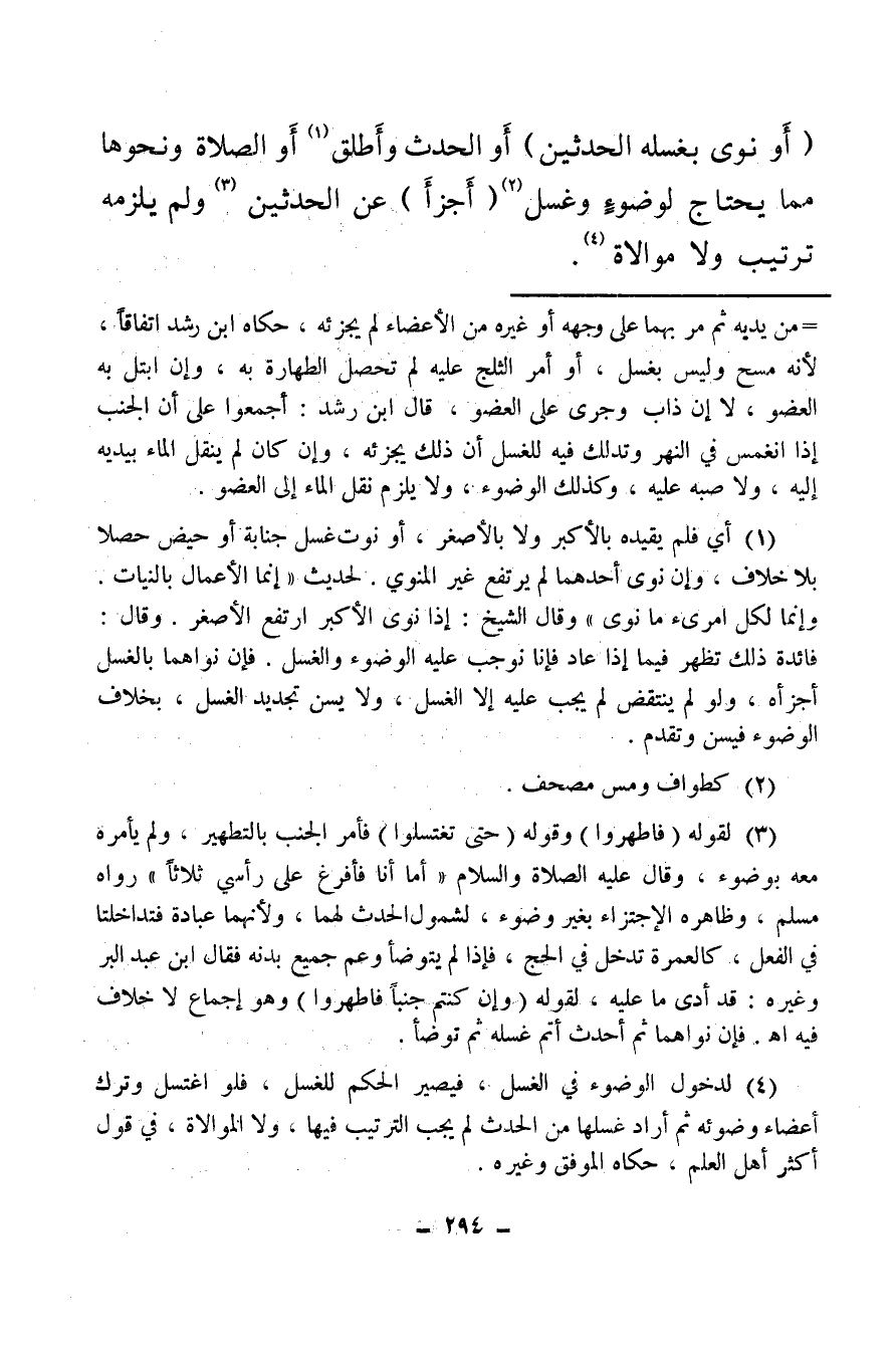 (¬1) أي فلم يقيده بالأكبر ولا بالأصغر، أو نوت غسل جنابة أو حيض حصلا بلا خلاف، وإن نوى أحدهما لم يرتفع غير المنوي لحديث إنما الأعمال بالنيات وإنما لكل امرئ ما نوى، وقال الشيخ: إذا نوى الأكبر ارتفع الأصغر، وقال فائدة ذلك تظهر فيما إذا عاد فإنا نوجب عليه الوضوء والغسل فإن نواهما بالغسل أجزأه ولو لم ينتقض لم يجب عليه إلا الغسل، ولا يسن تجديد الغسل، بخلاف الوضوء فيسن وتقدم.