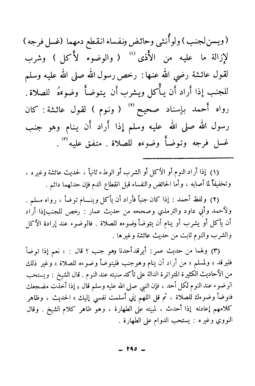(¬2) ولفظ أحمد: إذا كان جنبا فأراد أن يأكل وينام توضأ، رواه مسلم ولأحمد وأبي داود والترمذي وصححه من حديث عمار: رخص للجنب إذا أراد أن يأكل أو يشرب أو ينام أن يتوضأ وضوءه للصلاة، فالوضوء عند إرادة الأكل والشرب والنوم ثابت من حديث عائشة وغيرها.