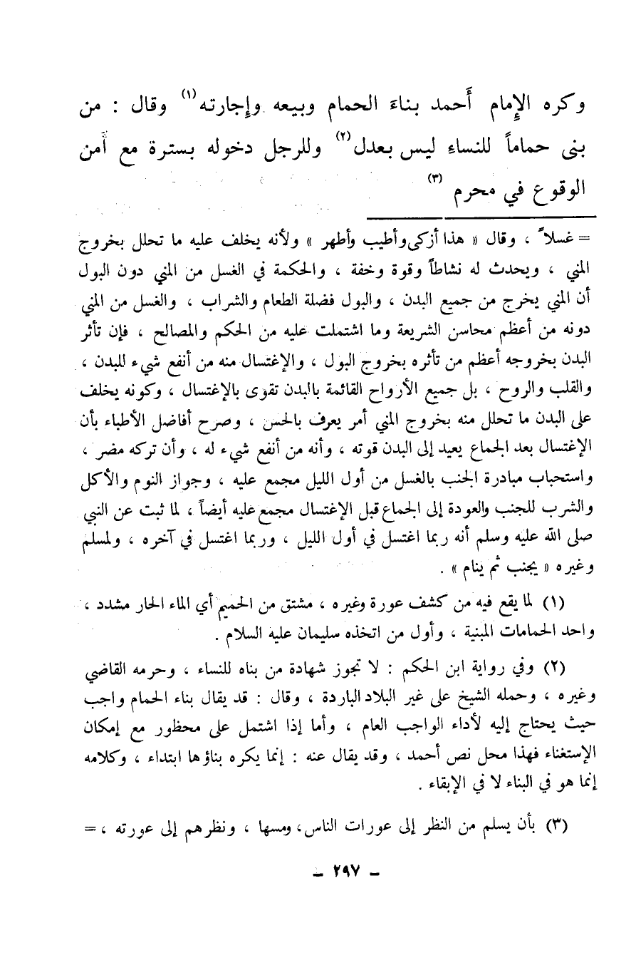 (¬2) وفي رواية ابن الحكم: لا تجوز شهادة من بناه للنساء، وحرمه القاضي وغيره، وحمله الشيخ على غير البلاد الباردة، وقال: قد يقال بناء الحمام واجب حيث يحتج إليه لأداء الواجب العام، وأما إذا اشتمل على محظور مع إمكان الاستغناء فهذا محل نص أحمد، وقد يقال عنه، إنما يكره بناؤها ابتداء وكلامه إنما هو في البناء لا في الإبقاء.