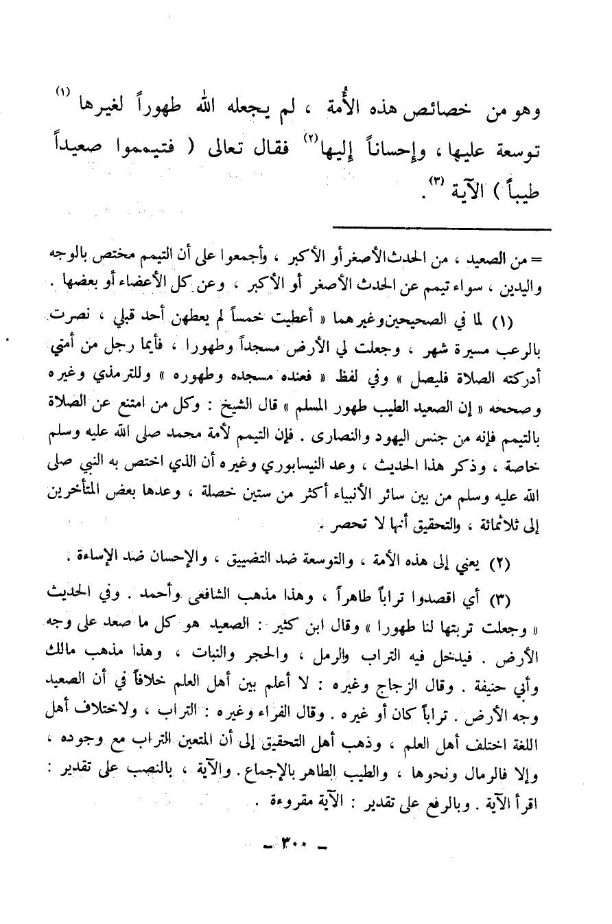 (¬1) لما في الصحيحين وغيرهما أعطيت خمسا لم يعطهن أحد قبلي، نصرت بالرعب مسيرة شهر، وجعلت لي الأرض مسجدا وطهورا، فأيما رجل من أمتي أدركته الصلاة فليصل، وفي لفظ فعنده مسجده وطهوره، وللترمذي وغيره وصححه إن الصعيد الطيب طهور المسلم، قال الشيخ: وكل من امتنع عن الصلاة بالتيمم فإنه من جنس اليهود والنصارى، فإن التيمم لأمة محمد صلى الله عليه وسلم خاصة، وذكر هذا الحديث وعد النيسابوري وغيره أن الذي اختص به النبي صلى الله عليه وسلم من بين سائر الأنبياء أكثر من ستين خصلة وعدها بعض المتأخرين إلى ثلاثمائة والتحقيق أنها لا تحصر.