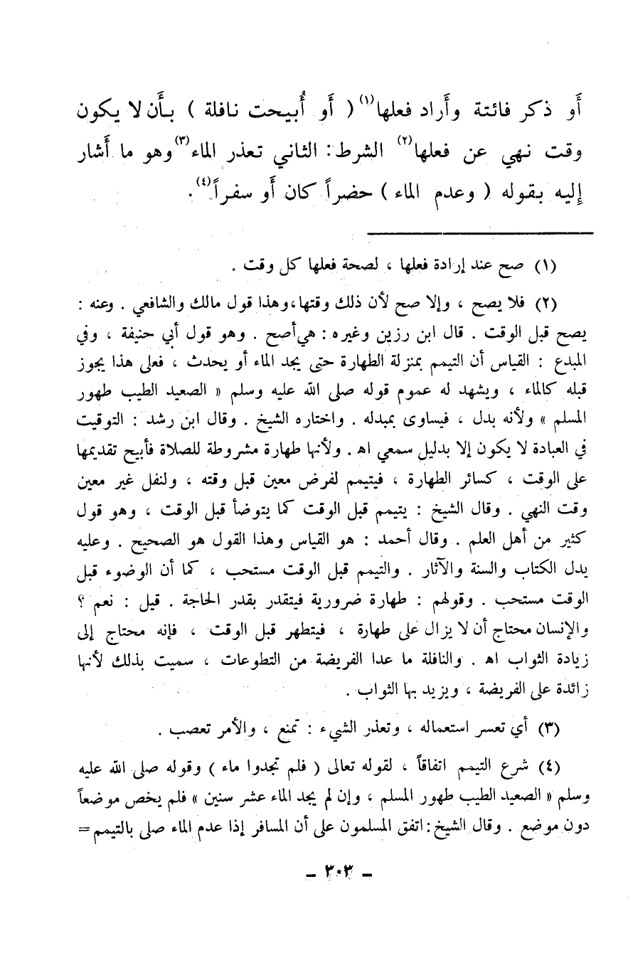 أو ذكر فائتة وأراد فعلها (¬1) (أو أبيحت نافلة) بأن لا يكون وقت نهي عن فعلها (¬2) الشرط: الثاني تعذر الماء (¬3) وهو ما أشار إليه بقوله (وعدم الماء) حضرا كان أو سفرا (¬4) .