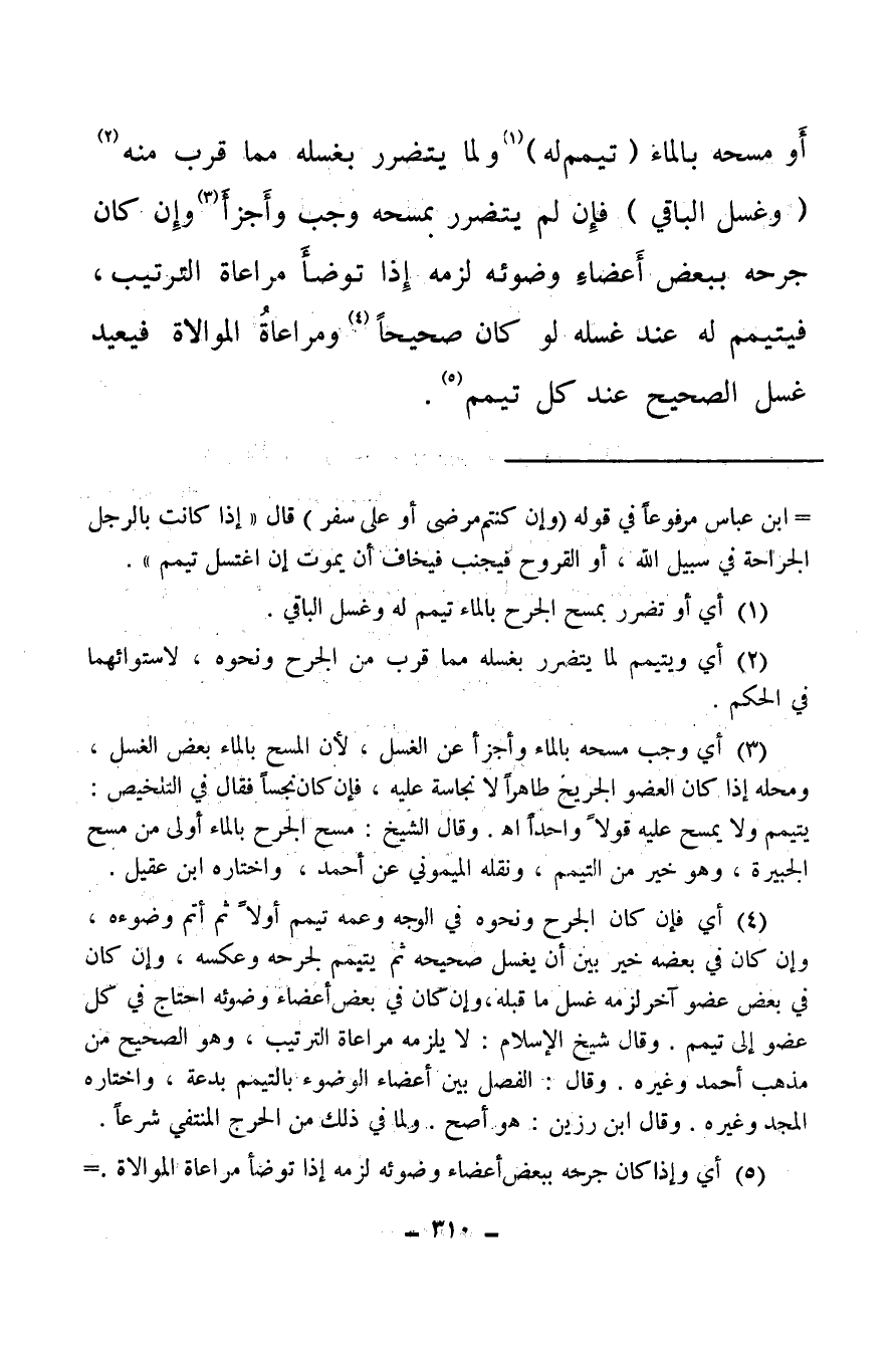 (¬4) أي فإن كان الجرح ونحوه في الوجه وعمه تيمم أولا ثم أتم وضوءه وإن كان في بعضه خير بين أن يغسل صحيحه ثم يتيمم لجرحه وعكسه، وإن كان في بعض عضو آخر لزمه غسل ما قبله، وإن كان في بعض أعضاء وضوئه احتاج في كل عضو إلى تيمم، وقال شيخ الإسلام لا يلزمه مراعاة الترتيب، وهو الصحيح من مذهب أحمد وغيره، وقال: الفصل بين أعضاء الوضوء بالتيمم بدعة، واختاره المجد وغيره، وقال ابن رزين: هو أصح، ولما في ذلك من الحرج المنتفي شرعا.