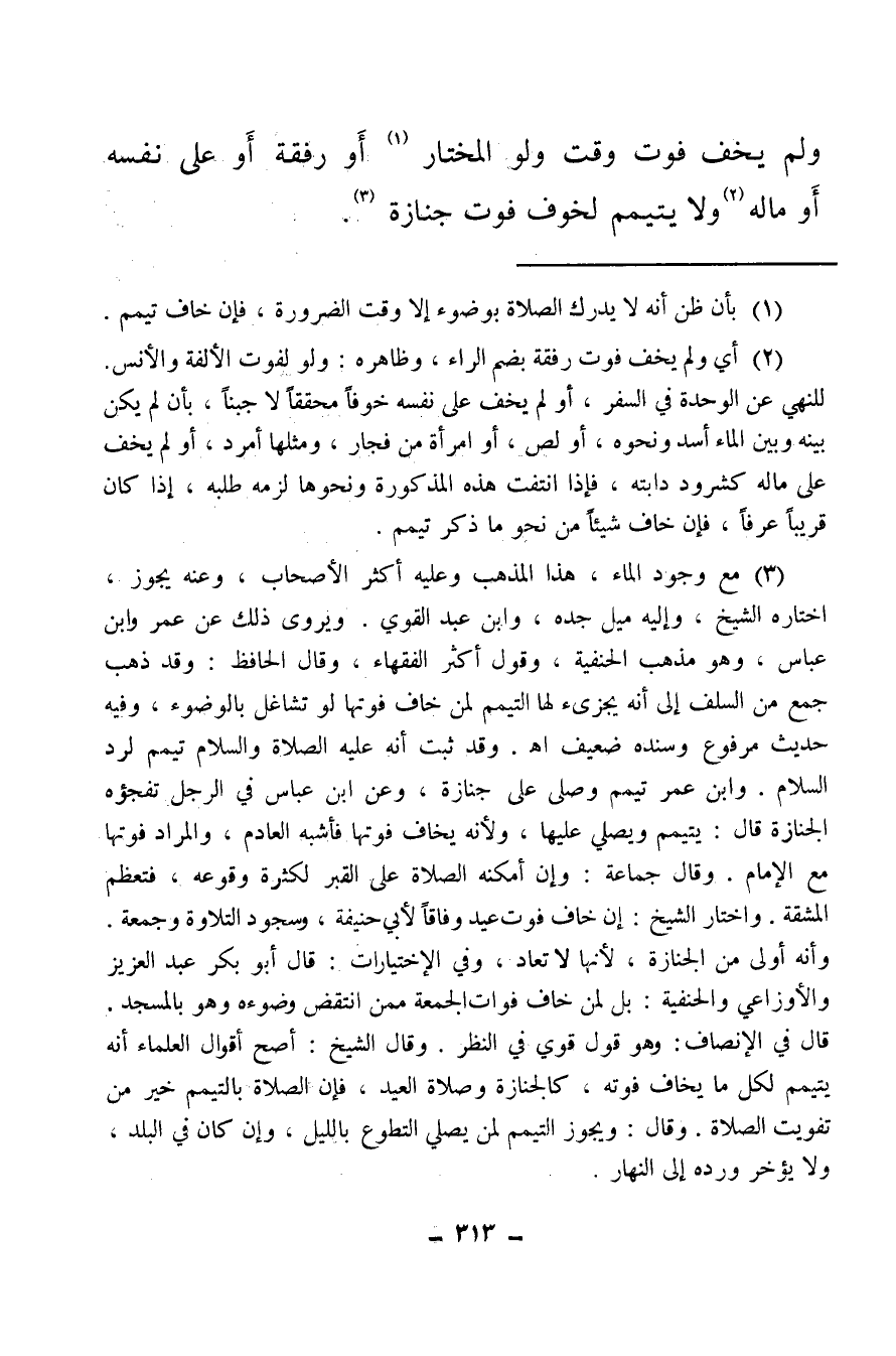 (¬3) مع وجود الماء هذا المذهب وعليه أكثر الأصحاب، وعنه يجوز، اختاره الشيخ، وإليه ميل جده، وابن عبد القوي، ويروى ذلك عن عمر وابن عباس، وهو مذهب الحنفية، وقول أكثر الفقهاء، وقال الحافظ: وقد ذهب جمع من السلف إلى أنه يجزئ لها التيمم لمن خاف فوتها لو تشاغل بالوضوء، وفيه حديث مرفوع وسنده ضعيف اهـ، وقد ثبت أنه عليه الصلاة والسلام تيمم لرد السلام، وابن عمر تيمم وصلى على جنازة، وعن ابن عباس، في الرجل تفجؤه الجنازة قال: يتيمم ويصلي عليها، ولأنه يخاف فوتها فأشبه العادم، والمراد فوتها مع الإمام، وقال جماعة: وإن أمكنه الصلاة على القبر لكثرة وقوعه، فتعظم المشقة، واختار الشيخ: إن خاف فوت عيد وفاقا لأبي حنيفة، وسجود التلاوة وجمعة وأنه أولى من الجنازة، لأنها لا تعاد، وفي الاختيارات: قال أبو بكر عبد العزيز والأوزاعي والحنفية: بل لمن خاف فوات الجمعة ممن انتقض وضوءه وهو بالمسجد قال في الإنصاف: وهو قول قوي في النظر، وقال الشيخ: أصح أقوال العلماء أنه يتيمم لكل ما يخاف فوته، كالجنازة وصلاة العيد، فإن الصلاة بالتيمم خير من تفويت الصلاة، وقال: ويجوز التيمم لمن يصلي التطوع بالليل، وإن كان في البلد، ولا يؤخر ورده إلى النهار.