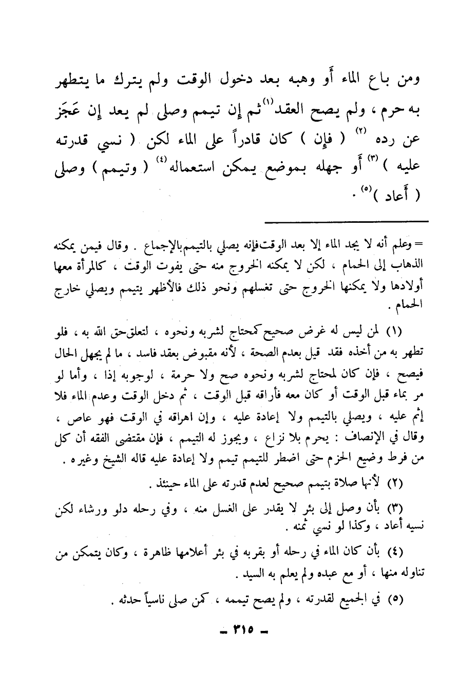 ومن باع الماء أو وهبه بعد دخول الوقت ولم يترك ما يتطهر به حرم، ولم يصح العقد (¬1) ثم إن تيمم وصلى لم يعد إن عجز عن رده (¬2) (فإن) كان قادرا على الماء لكن (نسي قدرته عليه) (¬3) أو جهله بموضع يمكن استعماله (¬4) (وتيمم) وصلى (أعاد) (¬5) .