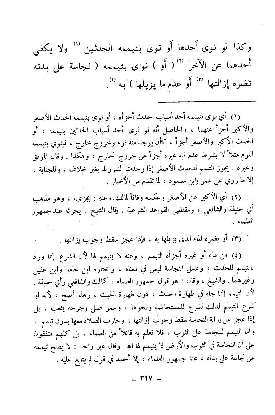 (¬4) من ماء أو غيره أجزأه التيمم، وعنه لا يتيمم لها لأن الشرع إنما ورد بالتيمم للحدث، وغسل النجاسة ليس في معناه، واختاره ابن حامد وابن عقيل وغيرهما. والشيخ وقال: هو قول جمهور العلماء، كمالك والشافعي وأبي حنيفة لأن التيمم إنما جاء في طهارة الحدث، دون طهارة الخبث، وهذا أصح، لأنه لو شرع التيمم لذلك لشرع للمستحاضة ونحوها، وعمر صلى وجرحه يثعب بل إذا عجز عن إزالة النجاسة سقط وجوب إزالتها، وجازت الصلاة معها بدون تيمم، وأما التميم للنجاسة على الثوب فلا نعلم به قائلا من العلماء، بل كلهم متفقون على أن النجاسة في الثوب والأرض لا يتيمم لها اهـ، وقال غير واحد: لا يصح تيممه عن نجاسة على بدنه، عند جمهور العلماء، إلا أحمد في قول لم يتابع عليه.