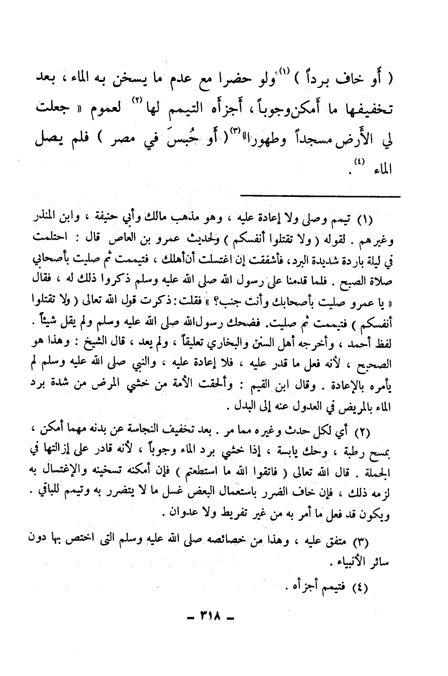 (¬1) تيمم وصلى ولا إعادة عليه، وهو مذهب مالك وأبي حنيفة، وابن المنذر وغيرهم لقوله: {وَلا تَقْتُلُوا أَنْفُسَكُمْ} ولحديث عمرو بن العاص قال: احتلمت في ليلة باردة شديدة البرد، فأشفقت إن اغتسلت أن أهلك، فتيممت ثم صليت بأصحابي صلاة الصبح، فلما قدمنا على رسول الله صلى الله عليه وسلم ذكروا ذلك له، فقال: يا عمرو صليت بأصحابك وأنت جنب؟ فقلت: ذكرت قول الله تعالى: {وَلا تَقْتُلُوا أَنْفُسَكُمْ} فتيممت ثم صليت، فضحك رسول الله صلى الله عليه وسلم ولم يقل شيئا، لفظ أحمد، وأخرجه أهل السنن والبخاري تعليقا، ولم يعد، قال الشيخ: وهذا هو الصحيح لأنه فعل ما قدر عليه فلا إعادة عليه والنبي صلى الله عليه وسلم لم يأمره بالإعادة وقال ابن القيم: وألحقت الأمة من خشي المرض من شدة برد الماء بالمريض في العدول عنه إلى البدل.