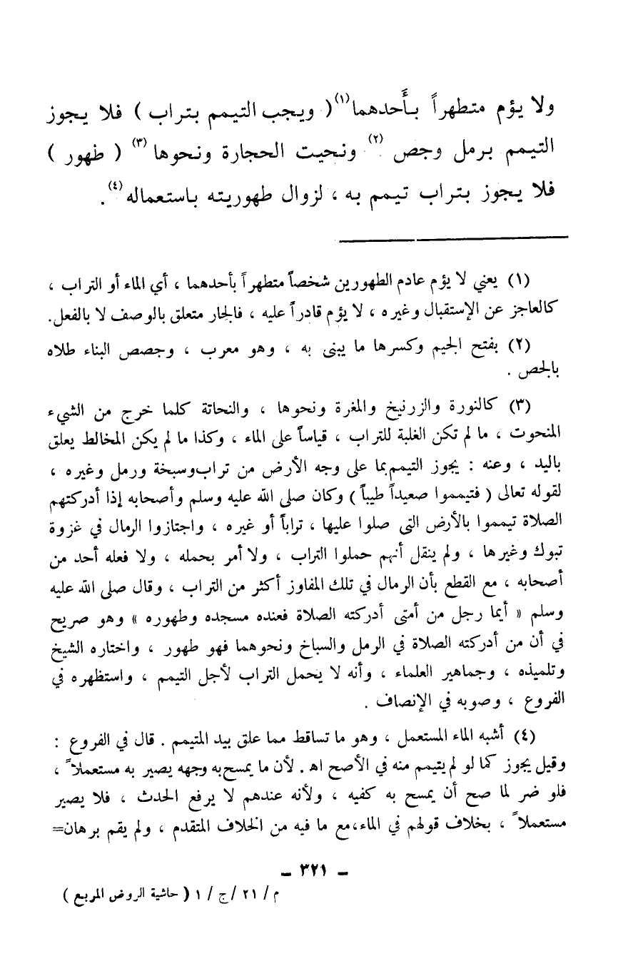(¬3) كالنورة والزرنيخ والمغرة ونحوها، والنحاتة كل ما خرج من الشيء المنحوت، مالم تكن الغلبة للتراب، قياسا على الماء، وكذا ما لم يكن المخالط يعلق باليد، وعنه: يجوز التيمم بما على وجه الأرض من تراب وسبخة، ورمل وغيره، لقوله تعالى: {فَتَيَمَّمُوا صَعِيدًا طَيِّبًا} وكان صلى الله عليه وسلم وأصحابه إذا أدركتهم الصلاة تيمموا بالأرض التي صلوا عليها، ترابا أو غيره، واجتازوا الرمال في غزوة تبوك وغيرها، ولم ينقل أنهم حملوا التراب، ولا أمر بحمله، ولا فعل أحد من أصحابه، مع القطع بأن الرمال في تلك المفاوز أكثر من التراب وقال صلى الله عليه وسلم أيما رجل من أمتي أدركته الصلاة فعنده مسجده وطهوره، وهو صريح في أن من أدركته الصلاة في الرمل والسباخ ونحوهما فهو طهور، واختاره الشيخ وتلميذه، وجماهير العلماء، وأنه لا يحمل التراب لأجل التيمم، واستظهره في الفروع، وصوبه في الإنصاف.