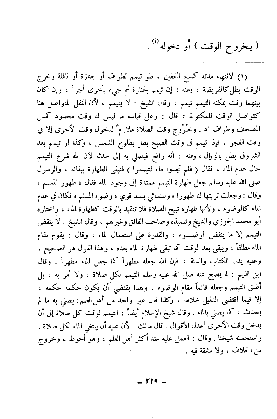 (¬1) لانتهاء مدته كمسح الخفين، فلو تيمم لطواف أو جنازة أو نافلة وخرج الوقت بطل كالفريضة، وعنه: إن تيمم لجنازة ثم جيء بأخرى أجزأ، وإن كان بينهما وقت يمكنه التيمم تيمم، وقال الشيخ: لا يتيمم، لأن النفل المتواصل هنا كتواصل الوقت للمكتوبة، قال: وعلى قياسه ما ليس له وقت محدود كمس المصحف وطواف اهـ وخروج وقت الصلاة ملازم لدخول وقت الأخرى إلا في وقت الفجر، فإذا تيمم في وقت الصبح بطل بطلوع الشمس، وكذا لو تيمم بعد الشروق بطل بالزوال وعنه: أنه رافع فيصلي به إلى حدثه لأن الله شرع التيمم حال عدم الماء فقال: {فَلَمْ تَجِدُوا مَاءً فَتَيَمَّمُوا} فتبقى الطهارة ببقائه والرسول صلى الله عليه وسلم جعل طهارة التيمم ممتدة إلى وجود الماء فقال طهور المسلم وقال: وجعلت تربتها لنا طهورا وللنسائي بسند قوي، وضوء المسلم، فكان في عدم الماء كالوضوء، ولأنها طهارة تبيح الصلاة فلا تتقيد بالوقت كطهارة الماء، واختاره أبو محمد الجوزي والشيخ وتلميذه وصاحب الفائق وغيرهم، وقال الشيخ: لا ينقض التيمم إلا ما ينقض الوضوء، والقدرة على استعمال الماء، وقال: يقوم مقام الماء مطلقًا ويبقى بعد الوقت كما تبقى طهارة الماء بعده وهذا القول هو الصحيح وعليه يدل الكتاب والسنة، فإن الله جعله مطهرا كما جعل الماء مطهرا، وقال ابن القيم: لم يصح عنه صلى الله عليه وسلم التيمم لكل صلاة، ولا أمر به، بل أطلق التيمم وجعله قائما مقام الوضوء، وهذا يقتضي أن يكون حكمه حكمه، إلا فيما اقتضى الدليل خلافه، وكذا قال غير واحد من أهل العلم: يصلي به ما لم يحدث، كما يصلي بالماء، وقال شيخ الإسلام أيضا، التيمم لوقت كل صلاة إلى أن يدخل وقت الأخرى أعدل الأقوال، قال مالك: لأن عليه أن يبتغي الماء لكل صلاة، واستحسنه شيخنا، وقال: العمل عليه عند أكثر أهل العلم، وهو أحوط، وخروج من الخلاف، ولا مشقة فيه.