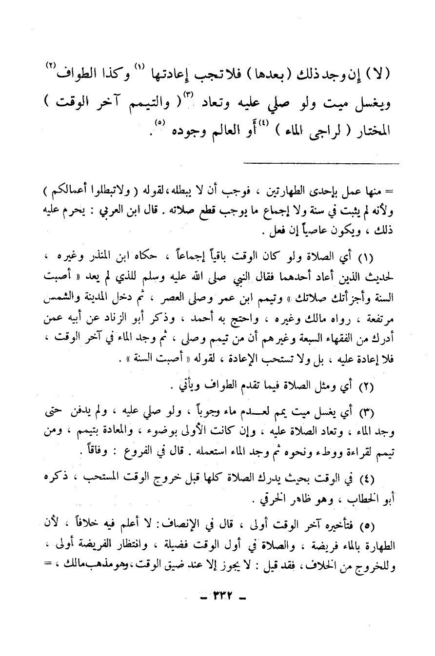(¬1) أي الصلاة ولو كان الوقت باقيا إجماعا، حكاه ابن المنذر وغيره لحديث الذين أعاد أحدهما فقال النبي صلى الله عليه وسلم للذي لم يعد أصبت السنة وأجزأتك صلاتك، وتيمم ابن عمر وصلي العصر، ثم دخل المدينة والشمس مرتفعة رواه مالك وغيره، واحتج به أحمد، وذكر أبو الزناد عن أبيه عمن أدرك من الفقهاء السبعة وغيرهم أن من تيمم وصلى، ثم وجد الماء في آخر الوقت، فلا إعادة عليه، بل ولا تستحب الإعادة، لقوله: أصبت السنة.