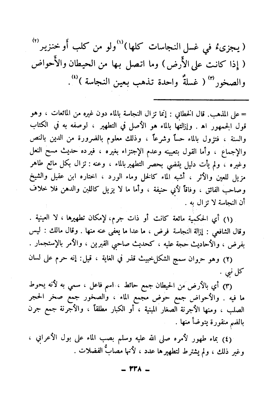 (يجزئ في غسل النجاسات كلها) (¬1) ولو من كلب أو خنزير (¬2) (إذا كانت على الأرض) وما اتصل بها من الحيطان والأحواض والصخور (¬3) (غسلة واحدة تذهب بعين النجاسة) (¬4) .