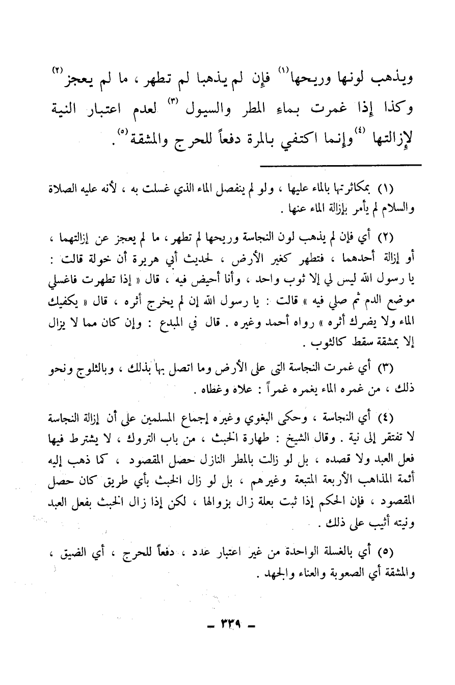 ويذهب لونها وريحها (¬1) فإن لم يذهبا لم تطهر، ما لم يعجز (¬2) وكذا إذا غمرت بماء المطر والسيول (¬3) لعدم اعتبار النية لإزالتها (¬4) وإنما اكتفي بالمرة دفعا للحرج والمشقة (¬5) .