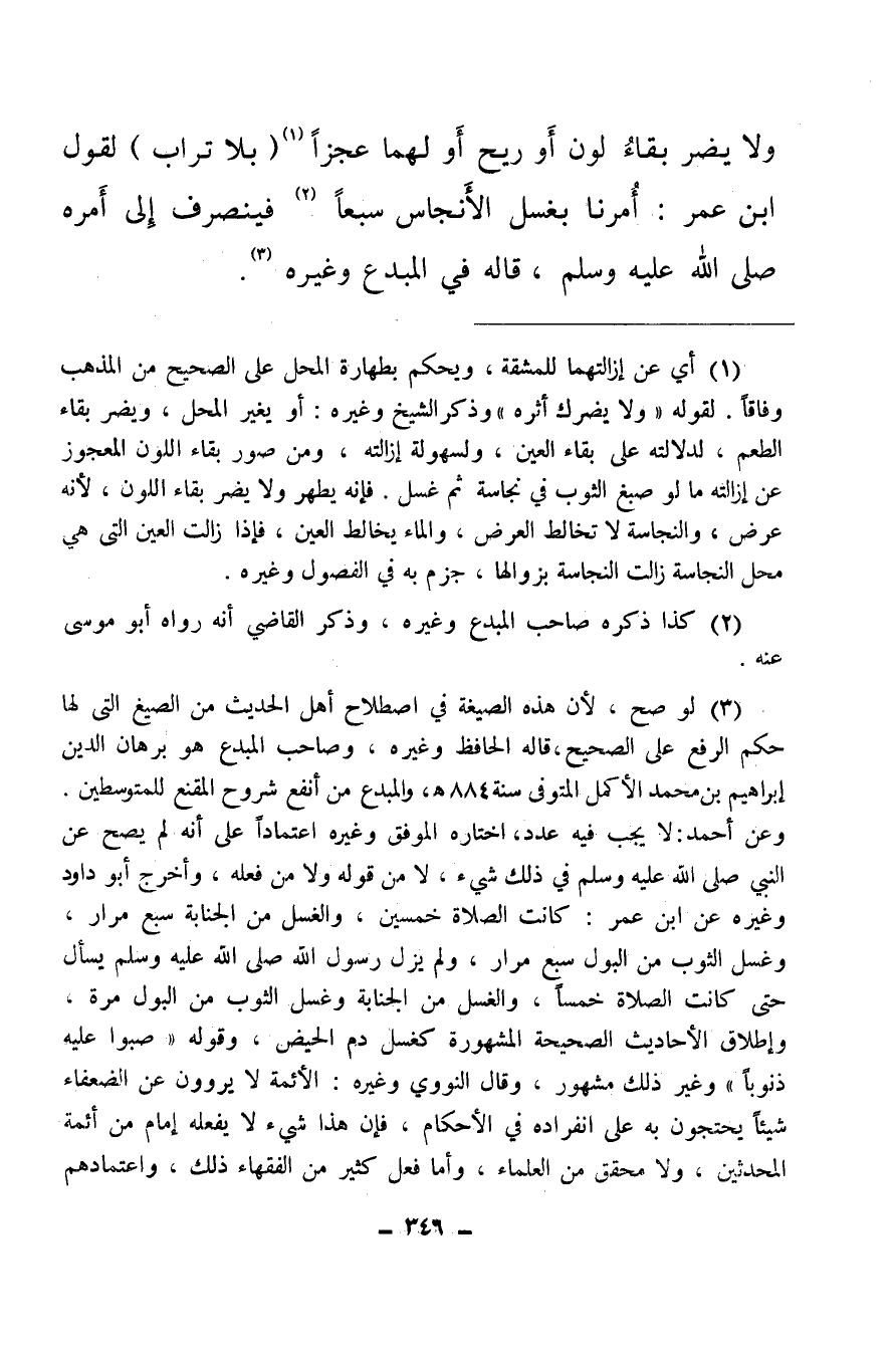 والمبدع من أنفع شروح المقنع للمتوسطين، وعن أحمد: لا يجب فيه عدد، اختاره الموفق وغيره اعتمادا على أنه لم يصح عن النبي صلى الله عليه وسلم في ذلك شيء، لا من قوله ولا من فعله، وأخرج أبو داود وغيره عن ابن عمر: كانت الصلاة خمسين، والغسل من الجنابة سبع مرار، وغسل الثوب من البول سبع مرار، ولم يزل رسول الله صلى الله عليه وسلم يسأل حتى كانت
