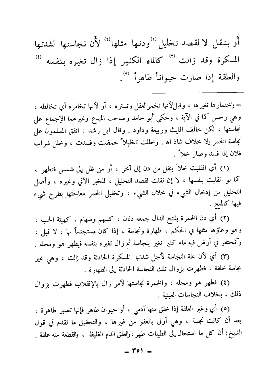 (¬5) أي وغير العلقة إذا خلق منها آدمي، أو حيوان طاهر فإنها تصير طاهرة بعد أن كانت نجسة، وهي أولى بالعفو من غيرها، والتحقيق ما تقدم في قول الشيخ: أن كل ما استحال إلى الطيبات طهر، والعلق الدم الغليظ، والقطعة منه علقة.
