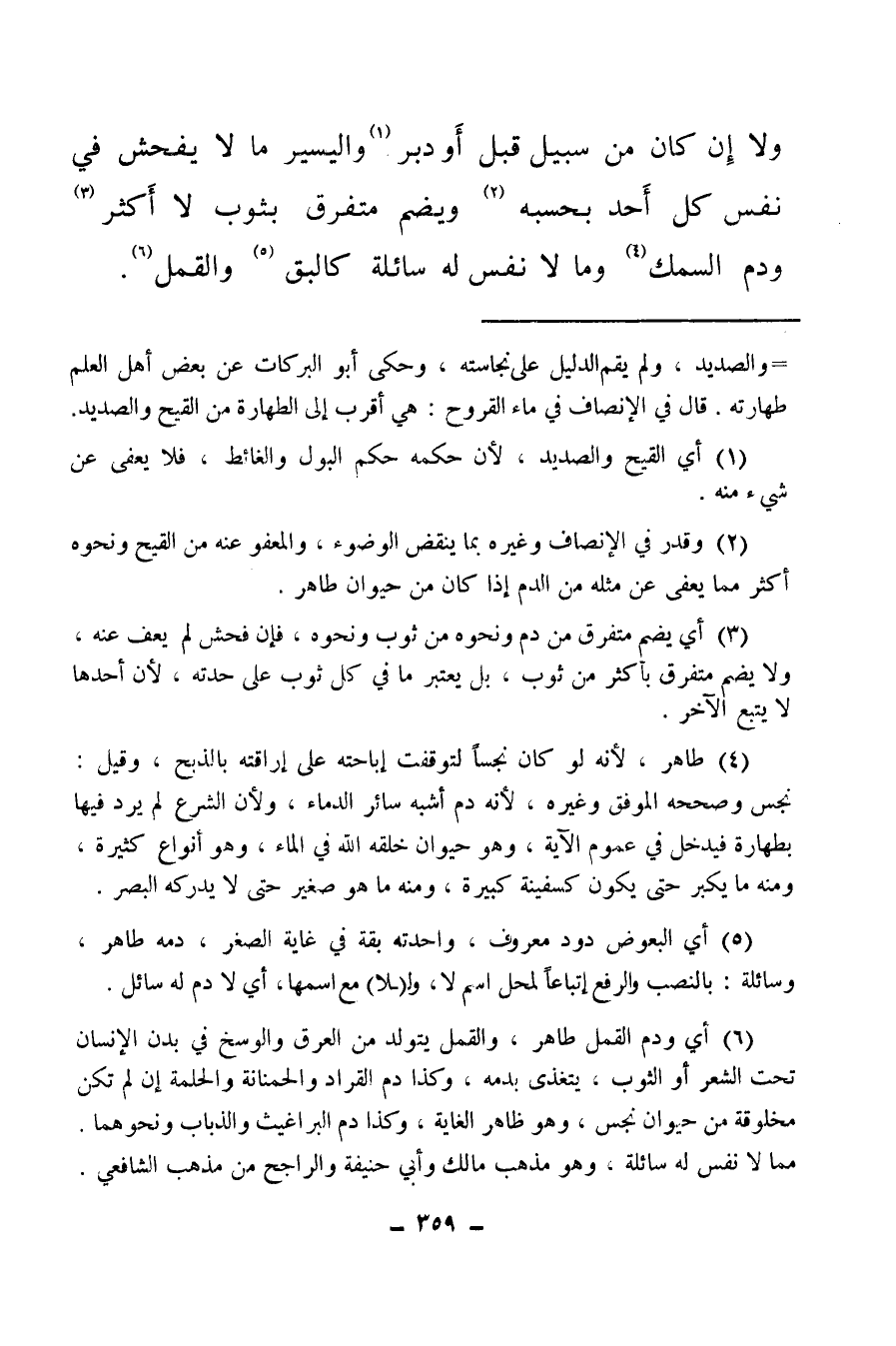 (¬4) طاهر: لأنه لو كان نجسا لتوقفت إباحته على إراقته بالذبح، وقيل: نجس وصححه الموفق وغيره، لأنه دم أشبه سائر الدماء، ولأن الشرع لم يرد فيها بطهارة فيدخل في عموم الآية، وهو حيوان خلقه الله في الماء، وهو أنواع كثيرة، ومنه ما يكبر حتى يكون كسفينة كبيرة، ومنه ما هو صغير حتى لا يدركه البصر.