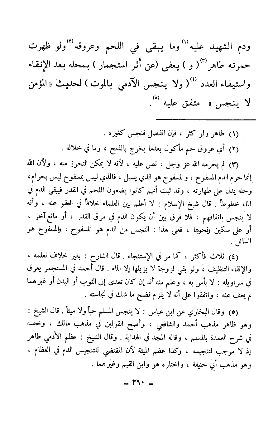 (¬3) لم يحرمه الله عز وجل، نص عليه لأنه لا يمكن التحرز منه، ولأن لله إنما حرم الدم المسفوح، والمسفوح هو الذي يسيل فالذي ليس بمسفوح ليس بحرام، وحله يدل على طهارته، وقد ثبت أنهم كانوا يضعون اللحم في القدر فيبقى الدم في الماء خطوطا قال الشيخ الإسلام: لا أعلم بين العلماء خلافا في العفو عنه، وأنه لا ينجس باتفاقهم فلا فرق بين أن يكون الدم في مرق القدر، أو مائع آخر، أو على سكين ونحوها، فعلى هذا: النجس من الدم هو المسفوح، والمسفوح هو السائل.