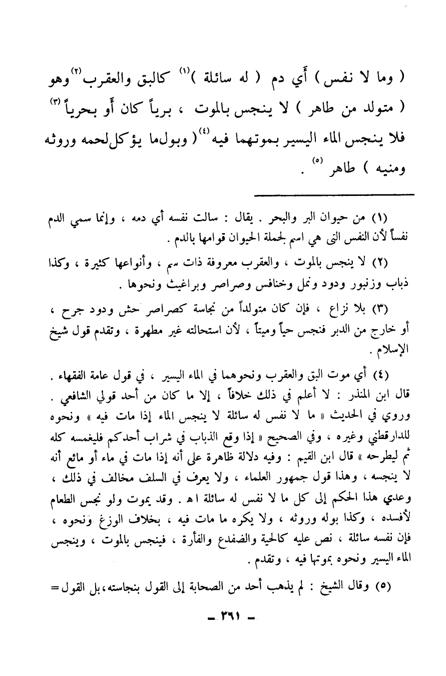 (¬5) وقال الشيخ: لم يذهب أحد من الصحابة إلى القول بنجاسته بل القول