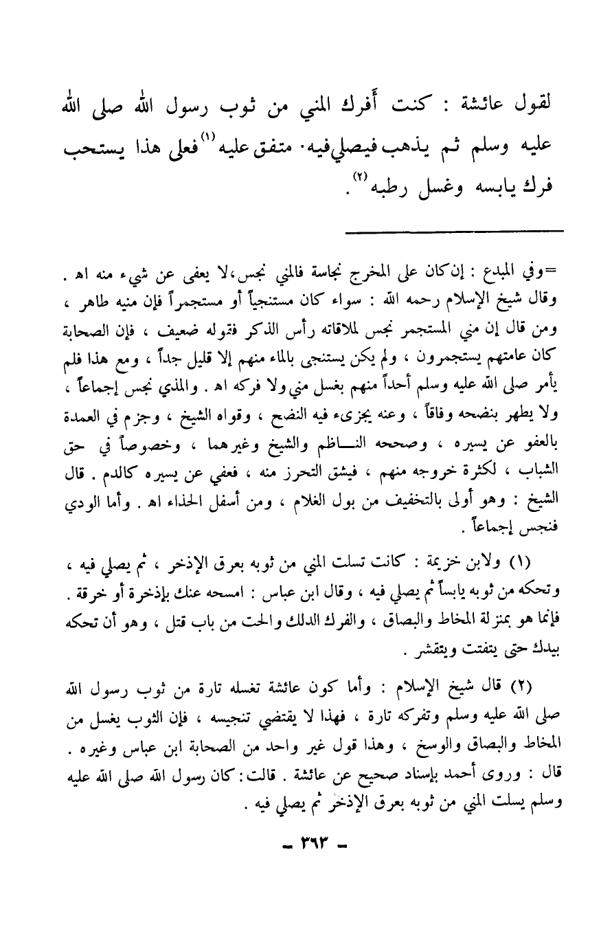 (¬2) قال شيخ الإسلام: وأما كون عائشة تغسله تارة من ثوب رسول الله صلى الله عليه وسلم وتفركه تارة، فهذا لا يقتضي تنجيسه فإن الثوب يغسل من المخاط والبصاق والوسخ، وهذا قول غير واحد من الصحابة ابن عباس وغيره، قال: وروى أحمد بإسناد صحيح عن عائشة، قالت: كان رسول الله صلى الله عليه وسلم يسلت المني من ثوبه بعرق الإذخر ثم يصلي فيه.