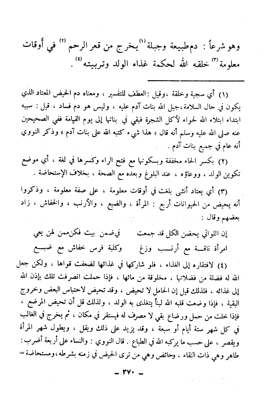 (¬4) لافتقاره إلى الغذاء، فلو شاركها في غذائها لضعفت قواها، ولكن جعل الله له فضلة من فضلاتها، مخلوقة من مائها، فإذا حملت انصرفت تلك بإذن الله إلى غذائه، فلذلك قيل إن الحامل لا تحيض، وقد تحيض لاحتباس البعض وخروج البقية، فإذا وضعت قلبه الله لبنا يتغذى به الولد، ولذلك قل أن تحيض المرضع، فإذا خلت من حمل ورضاع بقي لا مصرف له فيستقر في مكان، ثم يخرج في الغالب في كل شهر ستة أيام أو سبعة، وقد يزيد على ذلك ويقل، ويطول شهر المرأة ويقصر على حسب ما يركبه الله في الطباع، قال النووي: والنساء على أربعة أضرب: طاهر وهي ذات النقاء، وحائض وهي من ترى الحيض في زمنه بشرطه ومستحاضة