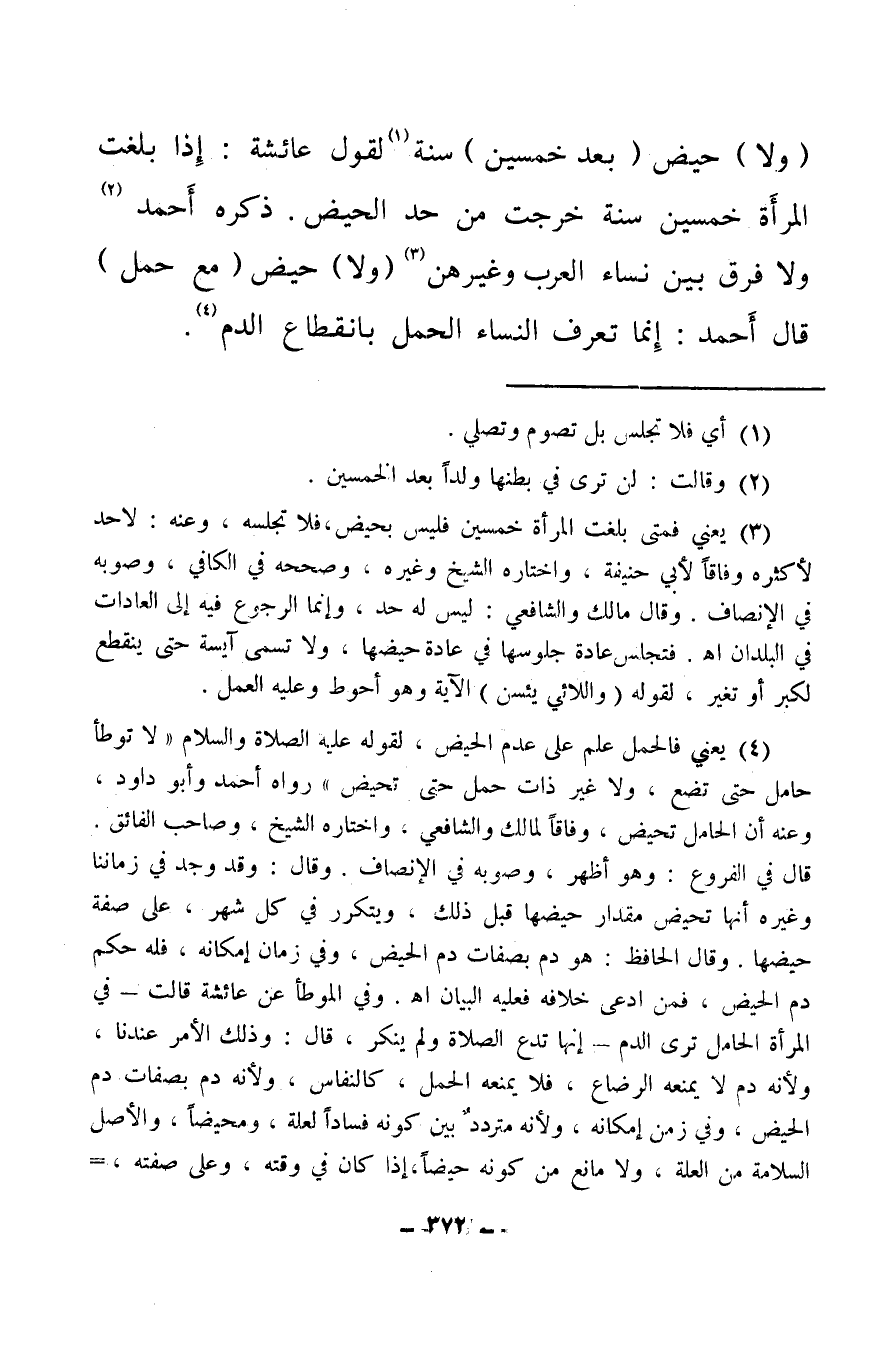 (ولا) حيض (بعد خمسين) سنة (¬1) لقول عائشة: (إذا بلغت المرأة خمسين سنة خرجت من حد الحيض) ، ذكره أحمد (¬2) ولا فرق بين نساء العرب وغيرهن (¬3) (ولا) حيض (مع حمل) قال أحمد: إنما تعرف النساء الحمل بانقطاع الدم (¬4) .