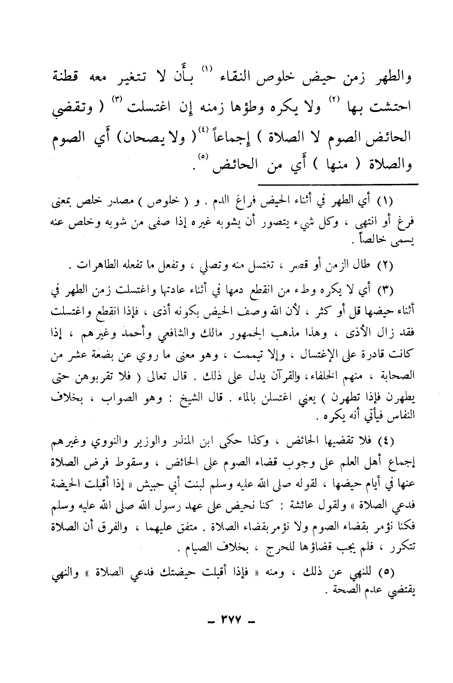 (¬1) أي الطهر في أثناء الحيض فراغ الدم، و (خلوص) مصدر خلص بمعنى فرغ أو انتهى، وكل شيء يتصور أن يشوبه غيره إذا صفى من شوبه وخلص عنه يسمى خالصا.