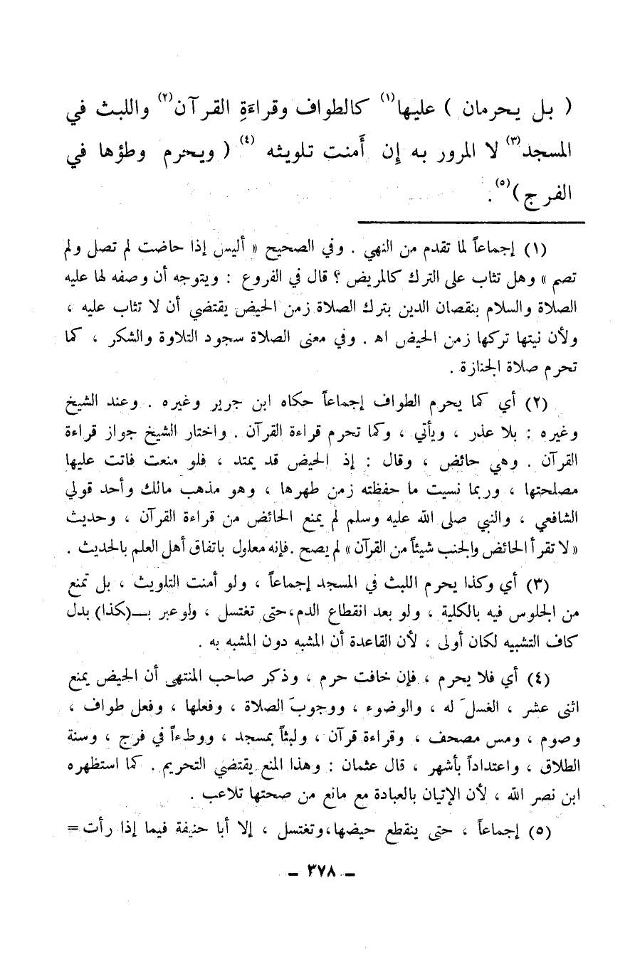 (¬2) أي كما يحرم الطواف إجماعا حكاه ابن جرير وغيره، وعند الشيخ وغيره: بلا عذر، ويأتي وكما تحرم قراءة القرآن، واختار الشيخ جواز قراءة القرآن، وهي حائض.