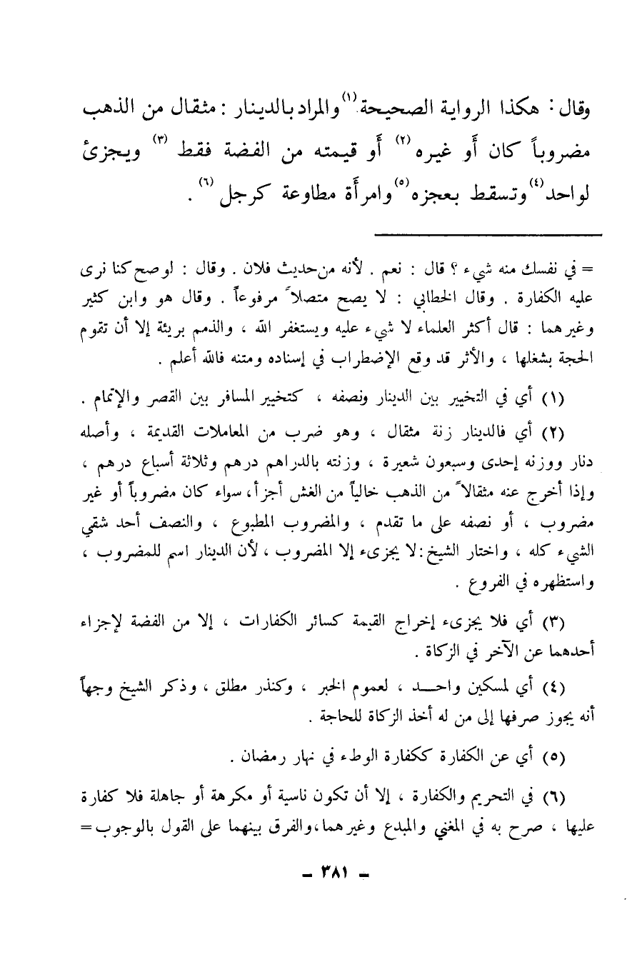 وقال: هكذا الرواية الصحيحة (¬1) والمراد بالدينار، مثقال من الذهب مضروبا كان أو غيره (¬2) أو قيمته من الفضة فقط (¬3) ويجزئ لواحد (¬4) وتسقط بعجزه (¬5) وامرأة مطاوعة كرجل (¬6) .