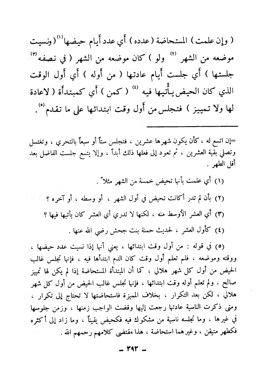 (¬5) في قوله: من أول وقت ابتدائها، يعني أنها إذا نسيت عدد حيضها، ووقته وموضعه، فلم تعلم أول وقت كان الدم ابتدأها فيه، فإنها تجلس غالب الحيض من أول كل شهر هلالي، كما أن المبتدأة المستحاضة إذا لم يكن لها تمييز صالح، ولم تعلم أوله وقت ابتدائها، فإنها تجلس غالب الحيض من أول كل شهر هلالي، لكن بعد التكرار، بخلاف المميزة فاستحاضتها لا تحتاج إلى تكرار، ومتى ذكرت الناسية عادتها رجعت إليها وقضت الواجب زمنها، وزمن جلوسها في غيرها، وما تجلسه ناسية من مشكوك فيه فكحيض يقينا، وما زاد إلى أكثره فكطهر متيقن، وغيرهما استحاضة، هذا مقتضى كلامه رحمهم الله.