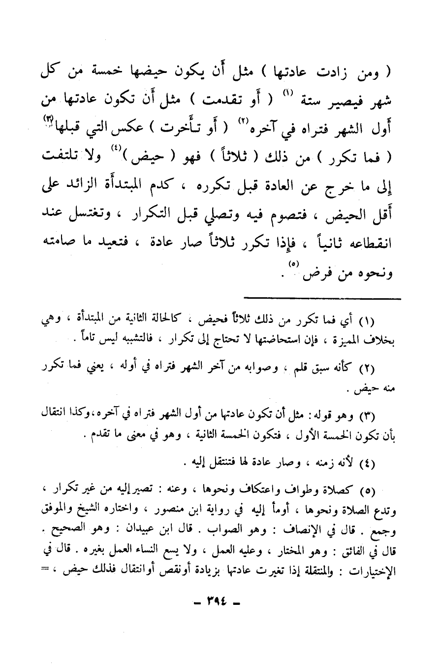 (¬5) كصلاة وطواف واعتكاف ونحوها، وعنه: تصير إليه من غير تكرار، وتدع الصلاة ونحوها، أومأ إليه في رواية ابن منصور، واختاره الشيخ والموفق وجمع، قال في الإنصاف، وهو الصواب، قال ابن عبيدان: وهو الصحيح، قال في الفائق: وهو المختار، وعليه العمل، ولا يسع النساء العمل بغيره، قال في الاختيارات والمنتقلة إذا تغيرت عادتها بزيادة أو نقص أو انتقال فذلك حيض