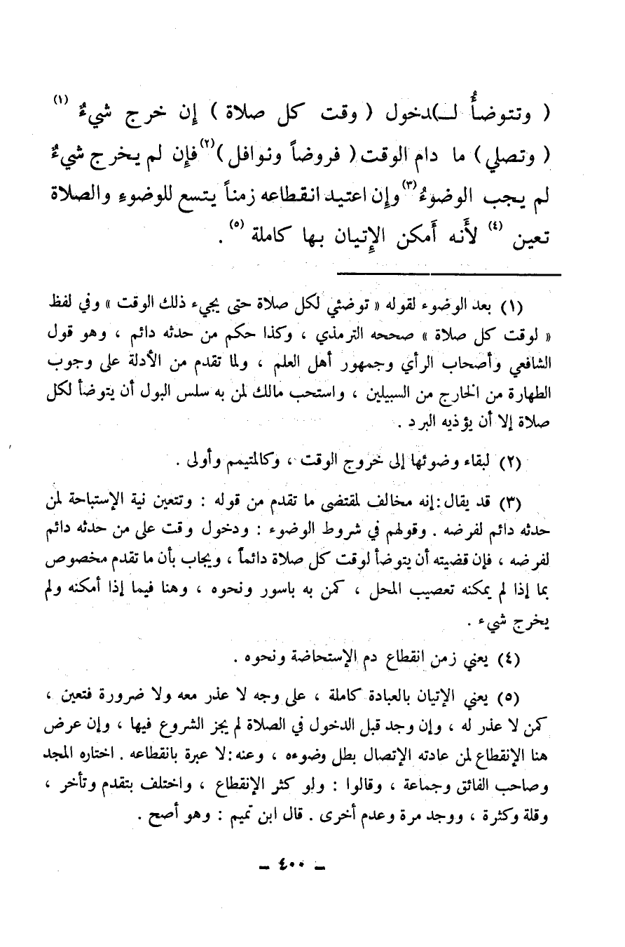 (¬5) يعني الإتيان بالعبادة كاملة، على وجه لا عذر معه ولا ضرورة فتعين، كمن لا عذر له، وإن وجد قبل الدخول في الصلاة لم يجز الشروع فيها، وإن عرض هنا الانقطاع لمن عادته الاتصال بطل وضوءه، وعنه لا عبرة بانقطاعه اختاره المجد وصاحب الفائق وجماعة، وقالوا: ولو كثر الانقطاع، واختلف بتقدم وتأخر، وقلة وكثرة، ووجد مرة وعدم أخرى، قال ابن تميم: وهو أصح.