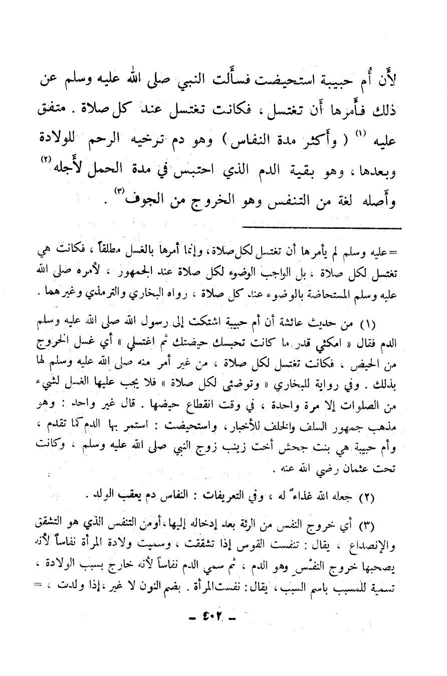 (¬1) من حديث عائشة أن أم حبيبة اشتكت إلى رسول الله صلى الله عليه وسلم الدم فقال: «امثي قدر ما كانت تحبسك حيضتك ثم اغتسلي» أي غسل الخروج من الحيض فكانت تغتسل لكل صلاة، من غير أمر منه صلى الله عليه وسلم لها بذلك، وفي رواية للبخاري: وتوضئي لكل صلاة، فلا يجب عليها الغسل لشيء من الصلوات إلا مرة واحدة، في وقت انقطاع حيضها، قال غير واحد: وهومذهب جمهور السلف والخلف للأخبار، واستحيضت استمر بها الدم كما تقدم، وأم حبيبة هي بنت جحش أخت زينب زوج النبي صلى الله عليه وسلم وكانت تحت عثمان رضي الله عنه.
