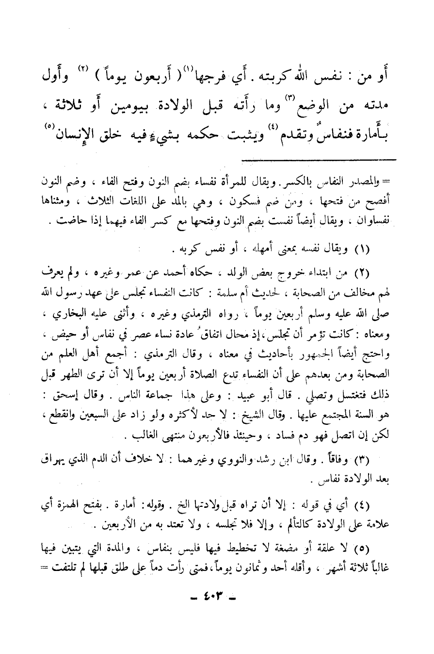 (¬5) لا علقة أو مضغة لا تخطيط فيها فليس بنفاس، والمدة التي يتبين فيها غالبا ثلاثة أشهر، وأقله أحد وثمانون يوما، فمتى رأت دما على طلق قبلها لم تلتفت