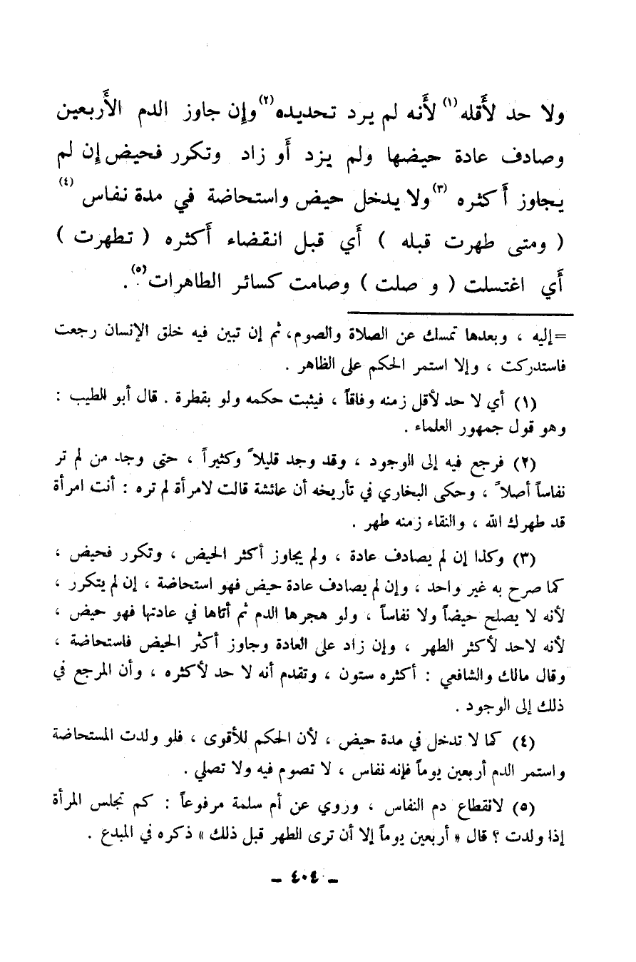 (¬2) فرجع فيه إلى الوجود وقد وجد قليلا وكثيرا، حتى وجد من لم تر نفاسا أصلا، وحكى البخاري في تاريخه أن عائشة قالت لامرأة لم تره: أنت امرأة قد طهرك الله والنقاء زمنه طهر.