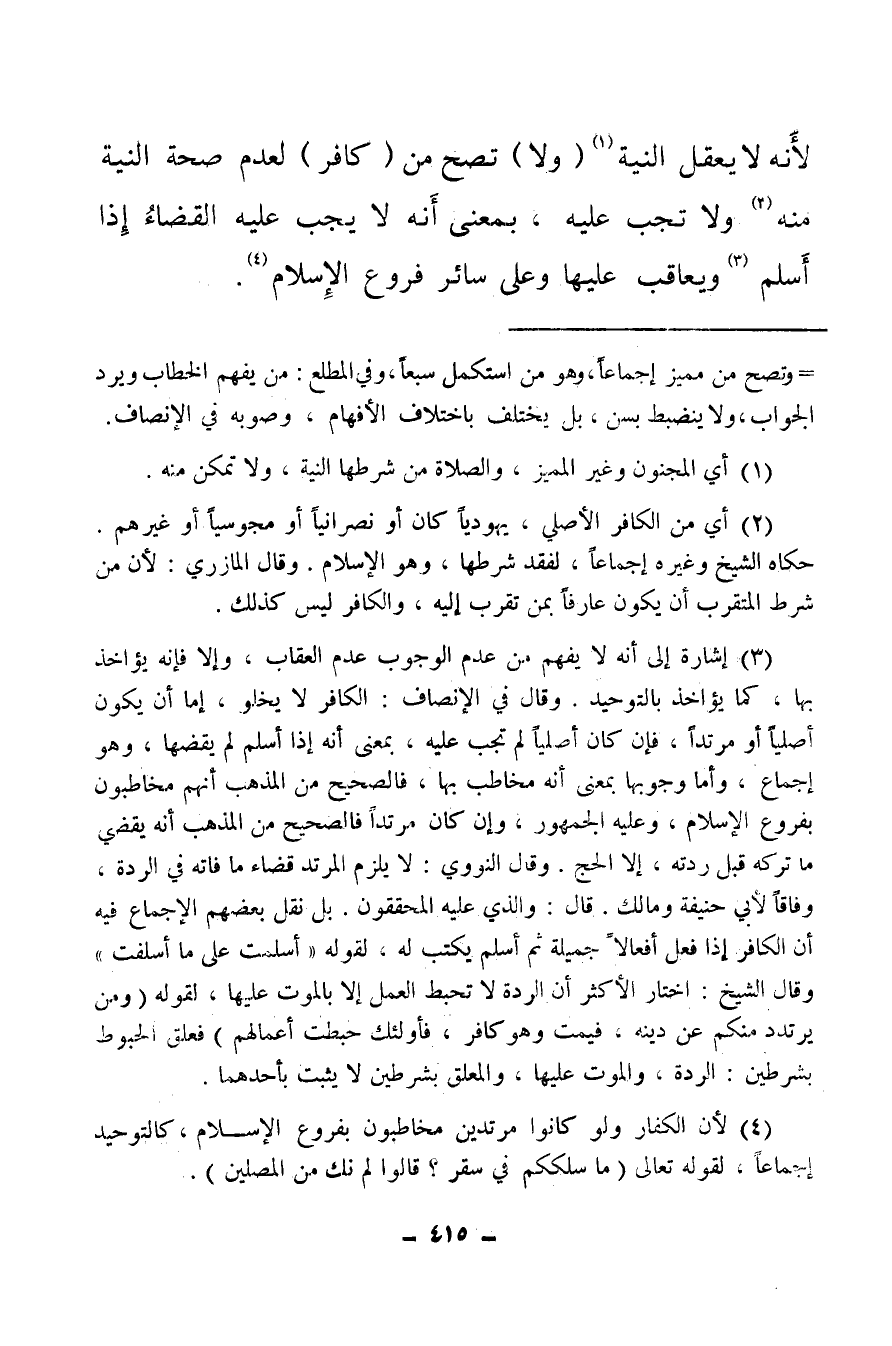 (¬4) لأن الكفار ولو كانوا مرتدين مخاطبون بفروع الإسلام كالتوحيد إجماعا لقوله تعالى: {مَا سَلَكَكُمْ فِي سَقَرَ * قَالُوا لَمْ نَكُ مِنَ الْمُصَلِّينَ} .
