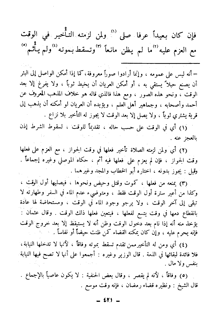 فإن كان بعيدًا عرفًا صلى (¬1) ولمن لزمته التأخير في الوقت مع العزم عليه (¬2) ما لم يظن مانعا (¬3) وتسقط بموته (¬4) ولم يأثم (¬5) .
