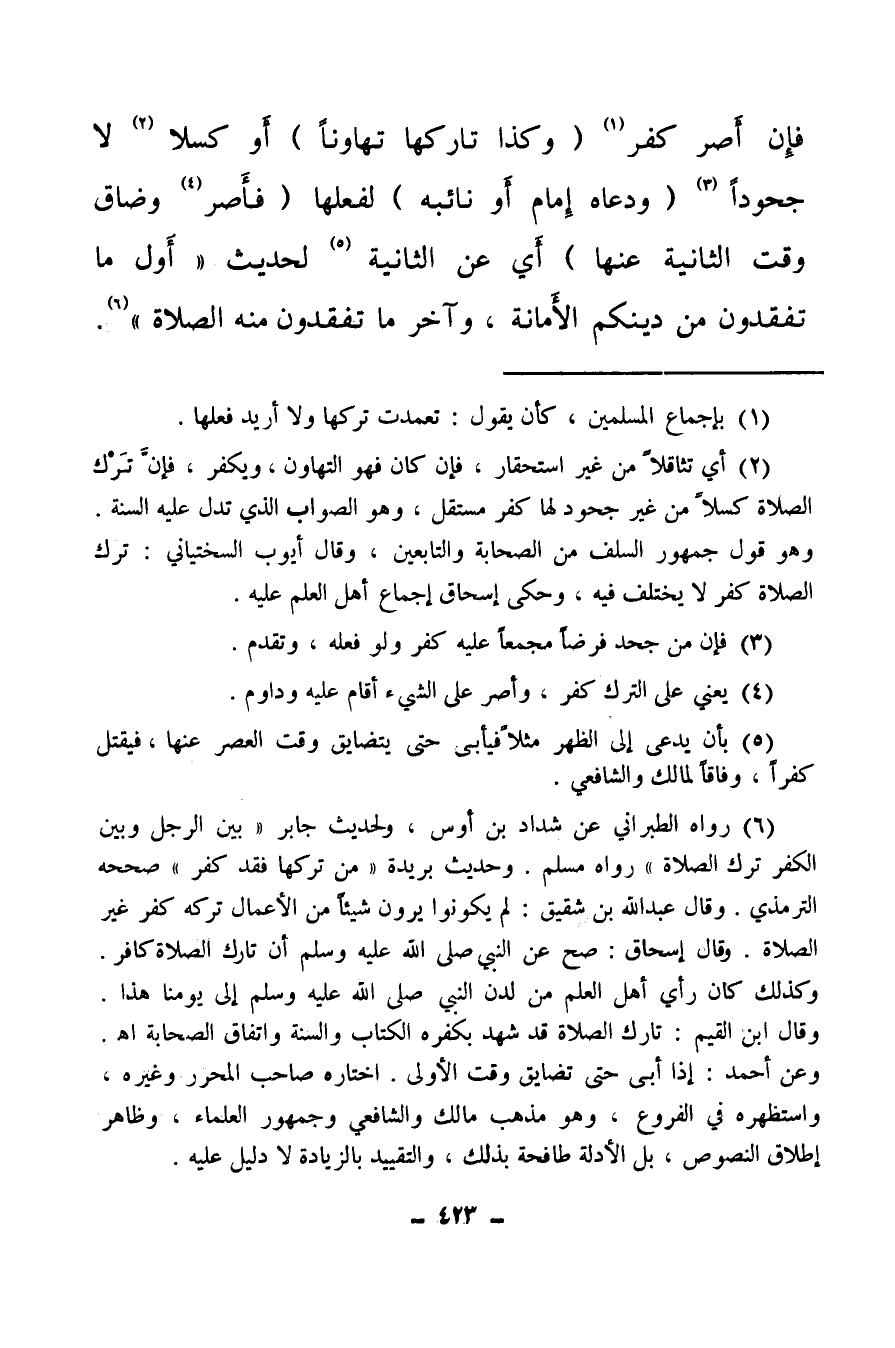 (¬6) رواه الطبراني عن شداد بن أوس، ولحديث جابر «بين الرجل وبين الكفر ترك الصلاة» ، رواه مسلم وحديث بريدة «من تركها فقد كفر» ، صححه الترمذي، وقال عبد الله بن شقيق، لم يكونوا يرون شيئا من الأعمال تركه كفر غير الصلاة وقال إسحاق صح عن النبي صلى الله عليه وسلم أن تارك الصلاة كافر، وكذلك كان رأي أهل العلم من لدن النبي صلى الله عليه وسلم إلى يومنا هذا، وقال ابن القيم: تارك الصلاة قد شهد بكفره الكتاب والسنة واتفاق الصحابة اهـ وعن أحمد: إذا أبى حتى تضايق وقت الأولى، اختاره صاحب المحرر وغيره، واستظهره في الفروع، وهو مذهب مالك والشافعي وجمهور العلماء، وظاهر إطلاق النصوص، بل الأدلة طافحة بذلك، والتقييد بالزيادة لا دليل عليه.
