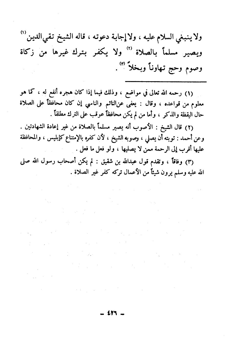 ولا ينبغي السلام عليه، ولا إجابة دعوته، قال الشيخ تقي الدين (¬1) ويصير مسلما بالصلاة (¬2) ولا يكفر بترك غيرها من زكاة وصوم وحج تهاونا وبخلا (¬3) .