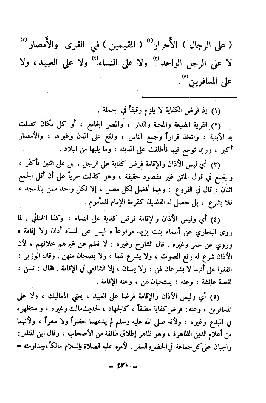 (¬5) أي وليس الأذان والإقامة فرضا على العبيد، يعني المماليك ولا على المسافرين وعنه فرض كفاية مطلقا كالجهاد لحديث مالك وغيره، واستظهره في المبدع وغيره ولأنه صلى الله عليه وسلم لم يدعهما حضرا ولا سفرا ولأنهما من أعلام الدين الظاهرة، وهو ظاهر إطلاق طائفة من الأصحاب، وقال ابن المنذر: واجبان على كل جماعة في الحضر والسفر، لأمره عليه الصلاة والسلام مالكا ومداومته صلى الله عليه وسلم هو أصحابه وقال السامري: لا فرق بين المصر والقرى، والحاضرين والمسافرين والواحد والجماعة.