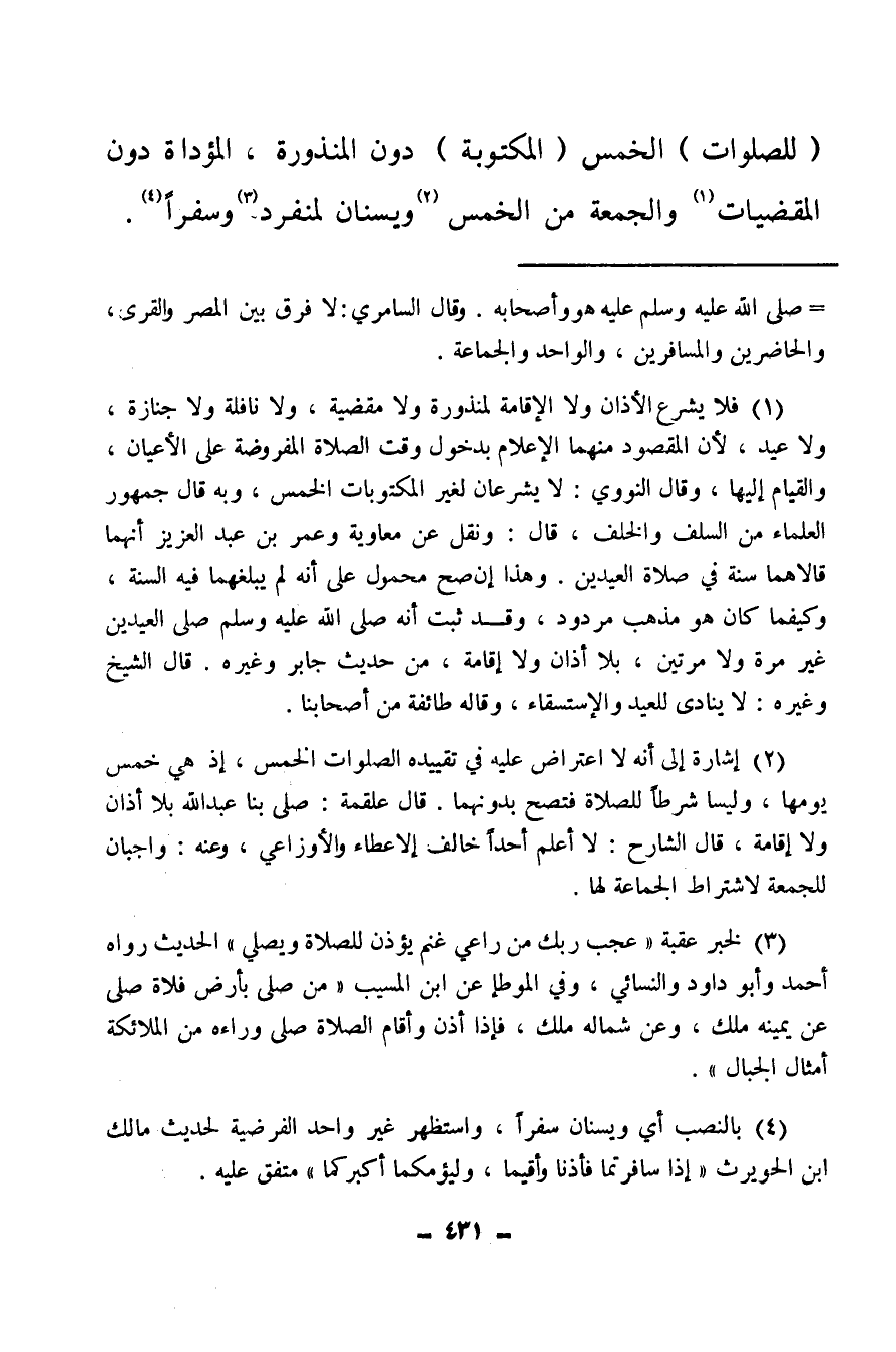 (¬1) فلا يشرع الأذان ولا الإقامة لمنذورة ولا مقضية، ولا نافلة ولا جنازة ولا عيد، لأن المقصود منهما الإعلام بدخول وقت الصلاة المفروضة، على الأعيان، والقيام إليها، وقال النووي: لا يشرعان لغير المكتوبات الخمس، وبه قال جمهور العلماء من السلف والخلف، قال: ونقل عن معاوية وعمر بن عبد العزيز أنهما قالاهما سنة في صلاة العيدين، وهذا إن صح محمول على أنه لم يبلغهما فيه السنة، وكيفما كان هو مذهب مردود، وقد ثبت أنه صلى الله عليه وسلم صلى العيدين غير مرة ولا مرتين، بلا أذان ولا إقامة، من حديث جابر وغيره، قال الشيخ وغيره، لا ينادي للعيد والاستسقاء، وقاله طائفة من أصحابنا.