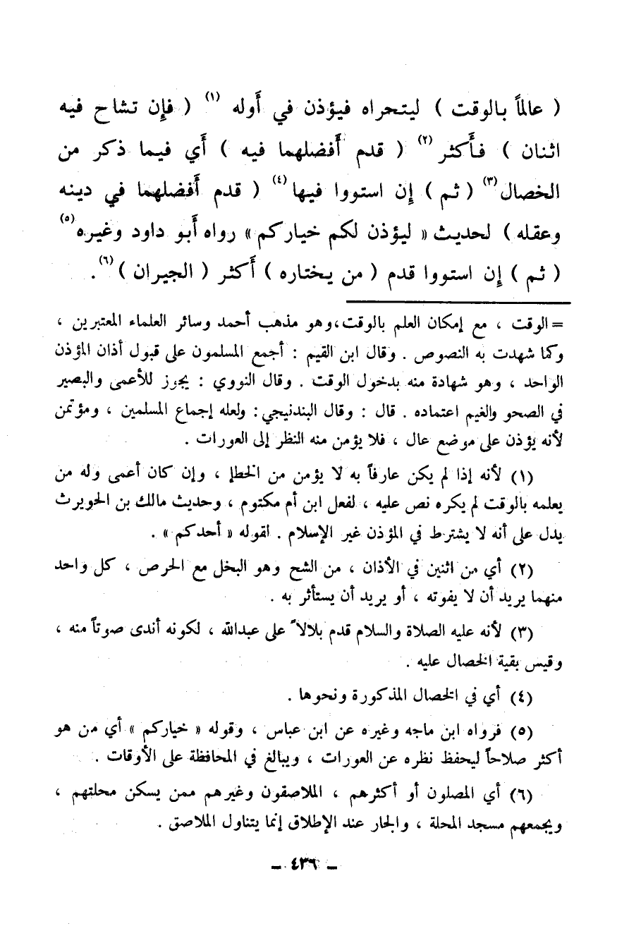 (عالما بالوقت) ليتحراه فيؤذن في أوله (¬1) (فإن تشاح فيه اثنان) فأكثر (¬2) (قدم أفضلهما فيه) أي فيما ذكر من الخصال (¬3) (ثم) إن استووا فيها (¬4) (قدم أفضلهما في دينه وعقله) لحديث ليؤذن لكم خياركم رواه أبو داود وغيره (¬5) (ثم) إن استووا قدم (من يختاره) أكثر (الجيران) (¬6) .
