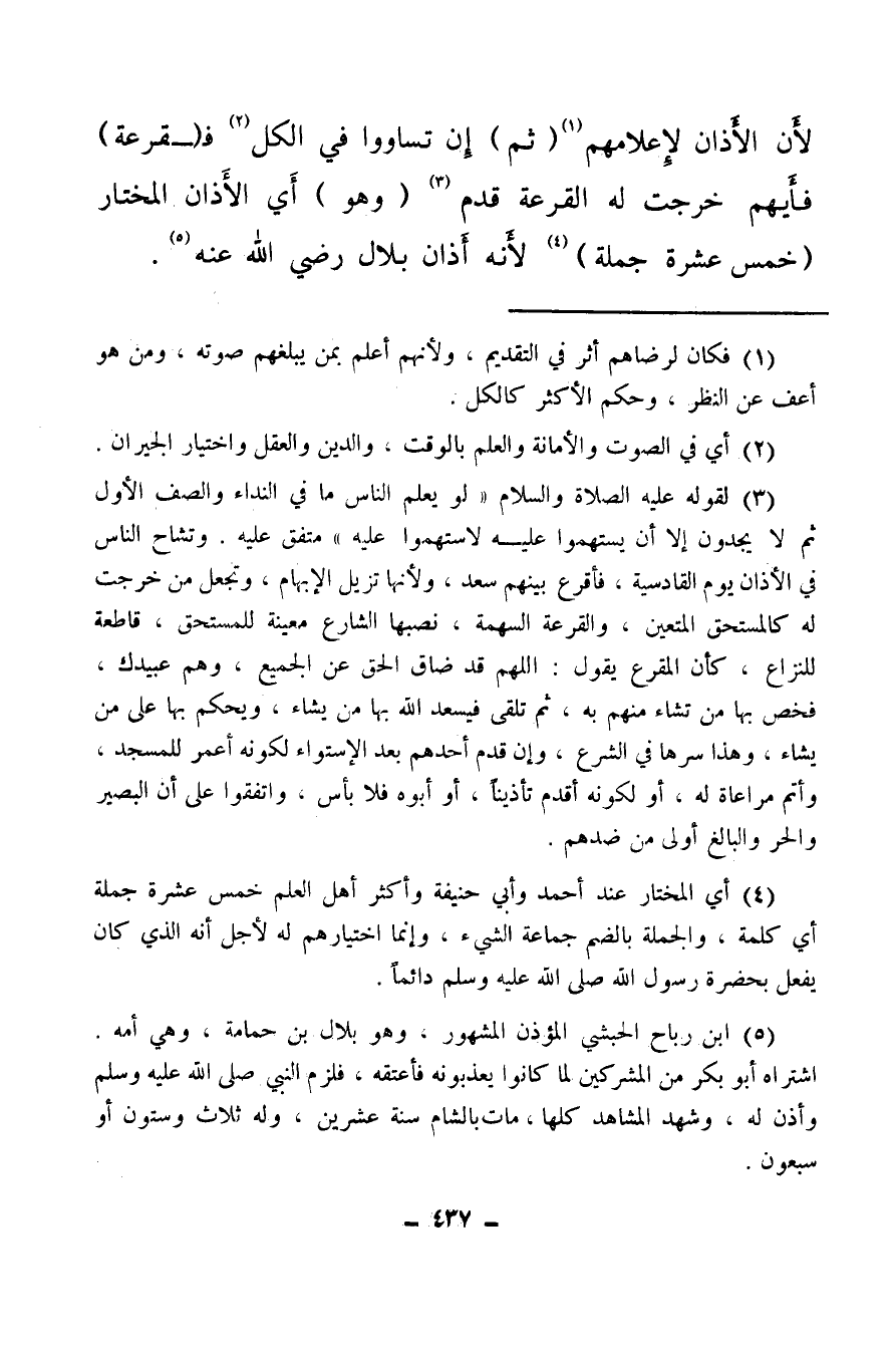 لأن الأذان لإعلامهم (¬1) (ثم) إن تساووا في الكل (¬2) فـ (قرعة) فأيهم خرجت له القرعة قدم (¬3) (وهو) أي الأذان المختار (خمس عشرة جملة) (¬4) لأنه أذان بلال رضي الله عنه (¬5) .