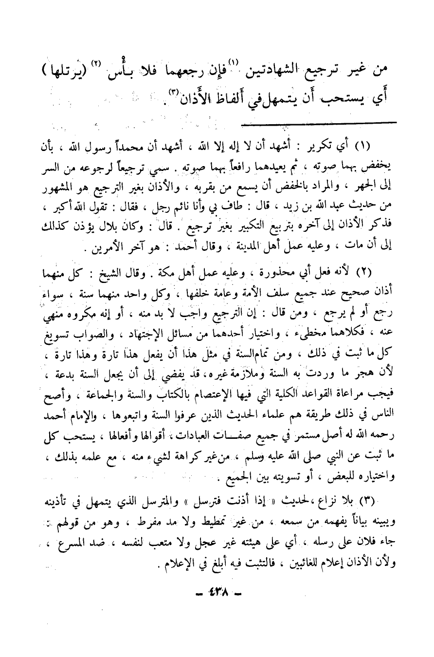 (¬2) لأنه فعل أبي محذورة، وعليه عمل أهل مكة، وقال الشيخ: كل منهما أذان صحيح عند جميع سلف الأمة وعامة خلفها، وكل واحد منهما سنة، سواء رجع أو لم يرجع، ومن قال: إن الترجيع واجب لا بد منه، أو إنه مكروه منهي عنه، فكلاهما مخطئ، واختيار أحدهما من مسائل الاجتهاد، والصواب تسويغ كل ما ثبت في ذلك، ومن تمام السنة في مثل هذا أن يفعل هذا تارة وهذا تارة، لأن هجر ما وردت به السنة وملازمة غيره، قد يفضي إلى أن يجعل السنة بدعة، فيجب مراعاة القواعد الكلية التي فيها الاعتصام بالكتاب والسنة والجماعة، وأصح الناس في ذلك طريقة هم علماء الحديث الذين عرفوا السنة واتبعوها، والإمام أحمد رحمه الله له أصل مستمر في جميع صفات العبادات، أقوالها وأفعالها، ييستحب كل ما ثبت عن النبي صلى الله عليه وسلم من غير كراهة لشيء منه، مع علمه بذلك واختياره للبعض، أو تسويته بين الجميع.