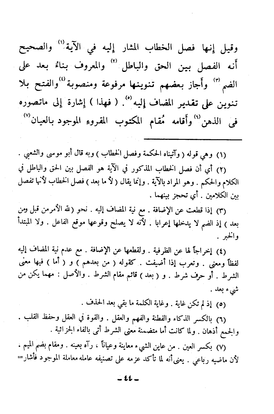 (¬2) أي أن فصل الخطاب المذكور في الآية هو الفصل بين الحق والباطل في الكلام والحكم، وهو المراد بالآية، وإنما يقال: (لأما بعد) فصل الخطاب لأنها تفصل بين الكلامين، أي تحجز بينهما.