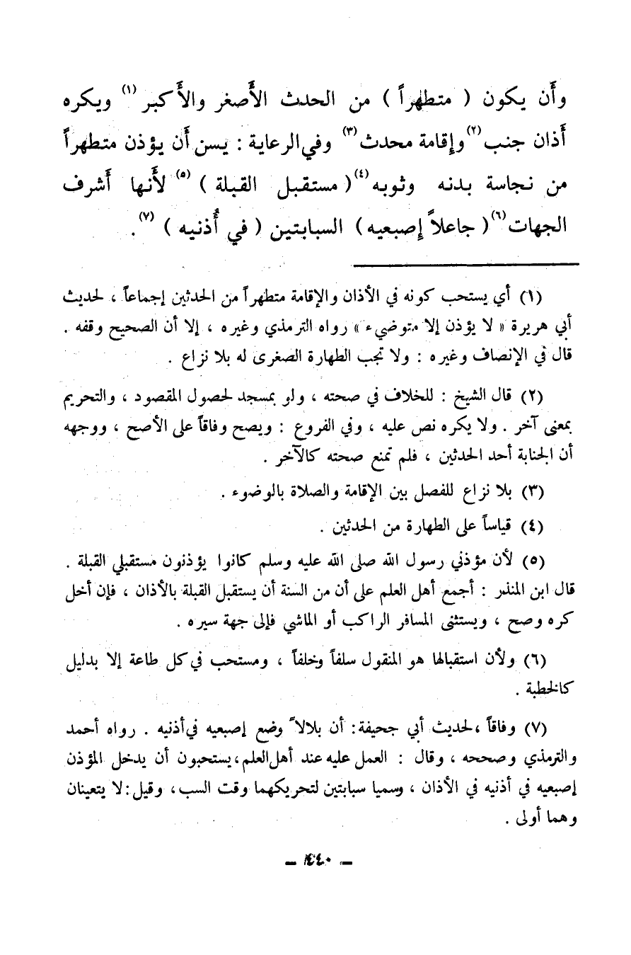 (¬7) وفاقا لحديث أبي جحيفة: أن بلالا وضع إصبعيه في أذنيه، رواه أحمد والترمذي وصححه، وقال: العمل عليه عند أهل العلم يستحبون أن يدخل المؤذن إصبعيه في أذنيه في الأذان، وسميا سبابتين لتحريكهما وقت السب، وقيل: لا يتعينان وهما أولى.