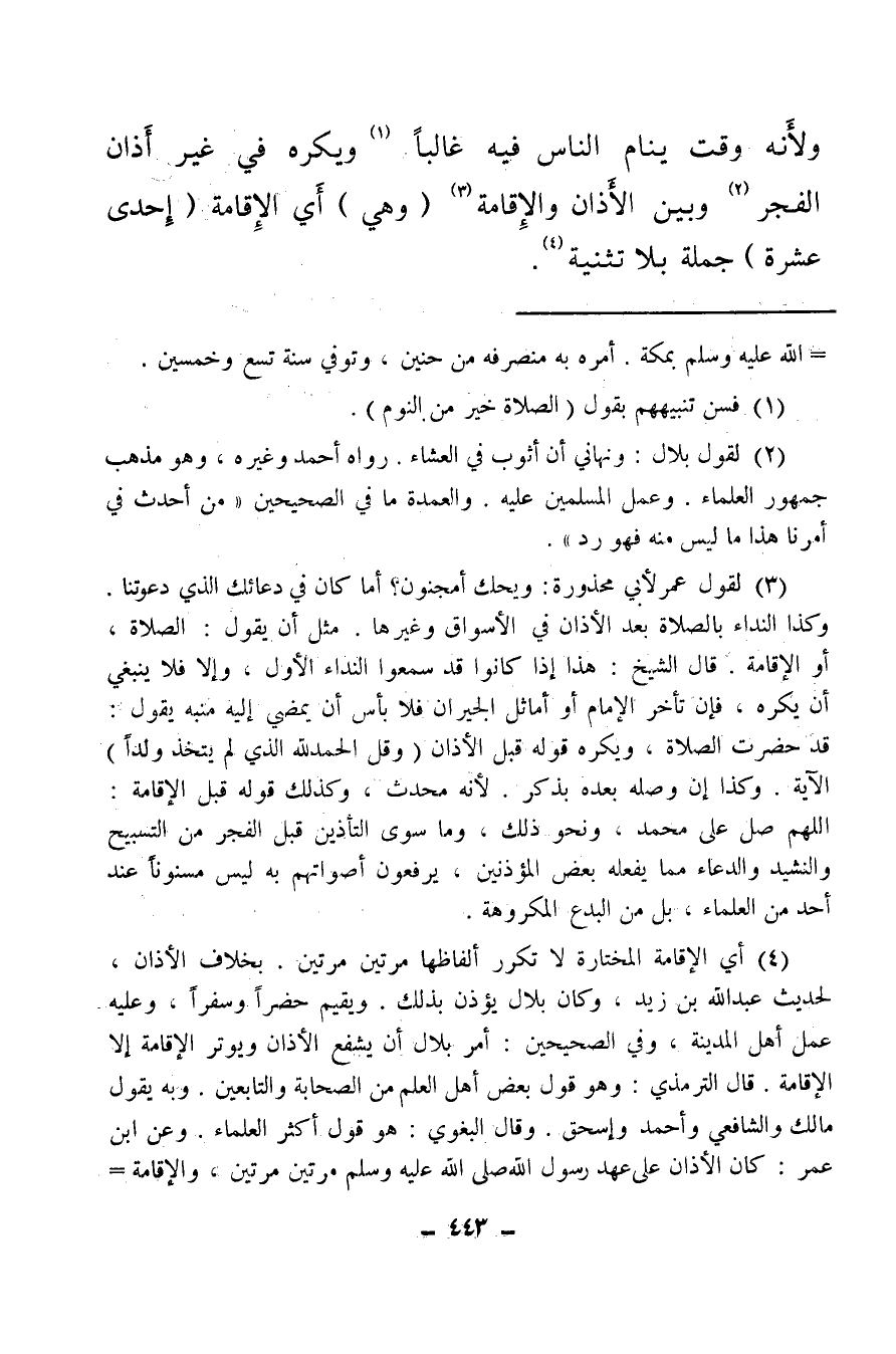 (¬3) لقول عمر لأبي محذورة: ويحك أمجنون؟ أما كان في دعائك الذي دعوتنا وكذا بالنداء بالصلاة بعد الأذان في الأسواق وغيرها، ومثل أن يقول: الصلاة أو الإقامة، قال الشيخ: هذا إذا كانوا قد سمعوا النداء الأول، وإلا فلا ينبغي أن يكره، فإن تأخر الإمام أو أماثل الجيران فلا بأس أن يمضي إليه منبه يقول قد حضرت الصلاة ويكره قوله قبل الأذان (وَقُلِ الْحَمْدُ للهِ الَّذِي لَمْ يَتَّخِذْ وَلَدًا) الآية، وكذا إن وصله بعده بذكر، لأنه محدث وكذلك قوله قبل الإقامة: اللهم صل على محمد، ونحو ذلك، وما سوى التأذين قبل الفجر من التسبيح والنشيد والدعاء مما يفعله بعض المؤذنين، يرفعون أصواتهم به ليس مسنونا عند أحد من العلماء، بل من البدع المكروهة.